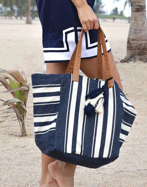 Nautical stripes make this tote bag the perfect companion for beach, pool, dinner at the marina or yachting trips. Ample sized yet not bulky with a cool ship chic look that beautifully complements crisp all white outfits or our nautical tunics and caftans.