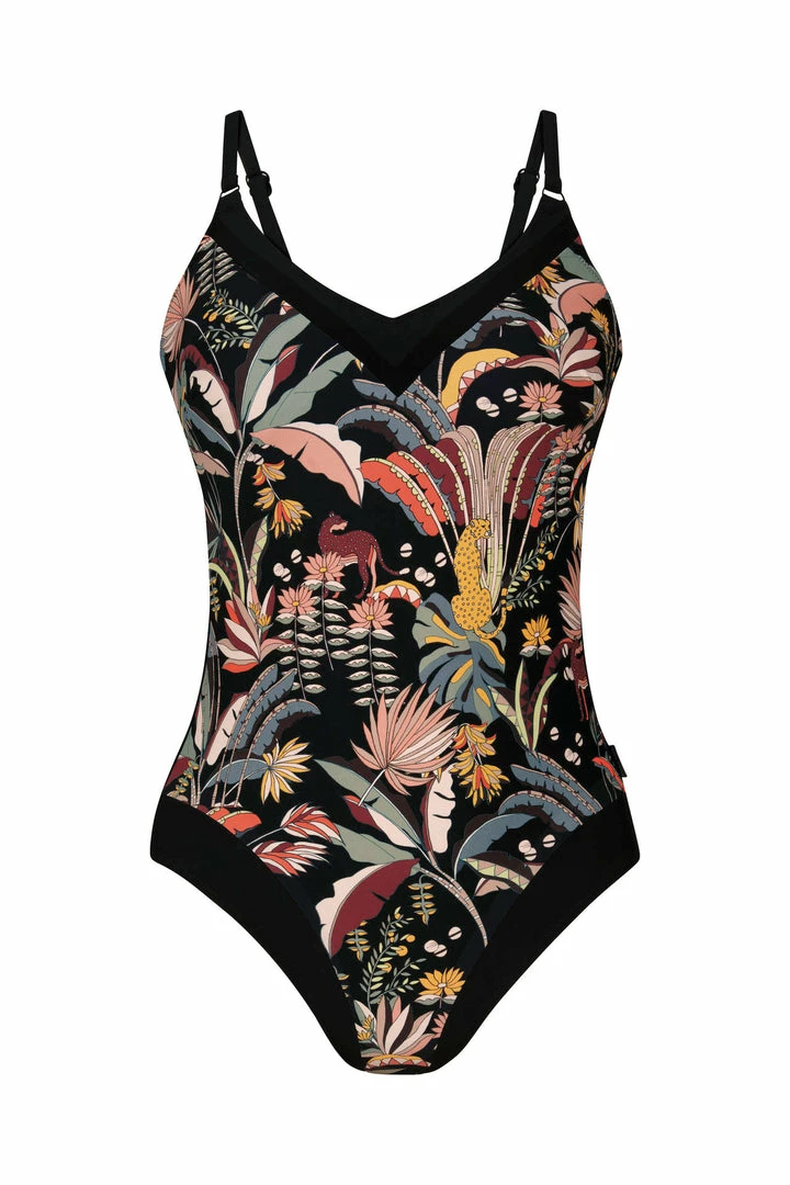 If you want a little more pizazz rhan a classic black suit, this is your suit to try! One piece with jungle prints with black background.