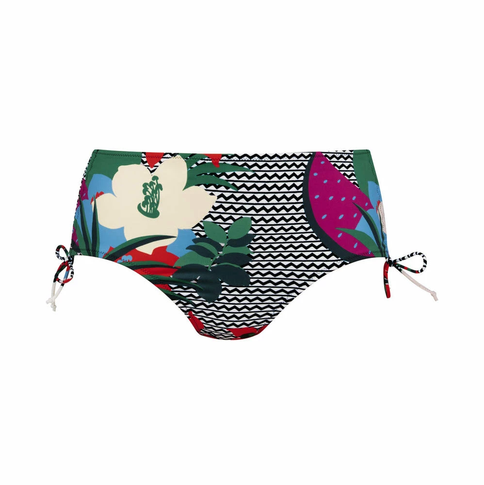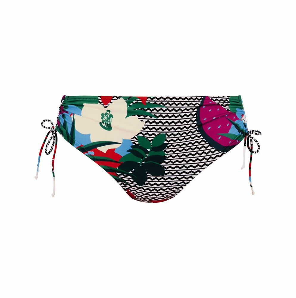 Hipster style swim bottom with adjustable drawstring sides that allow the wearer to decide how wide or narrow the piece sits on the hips. Small black and white chevron print with brightly colored flowers makes this a fun summer pattern.
