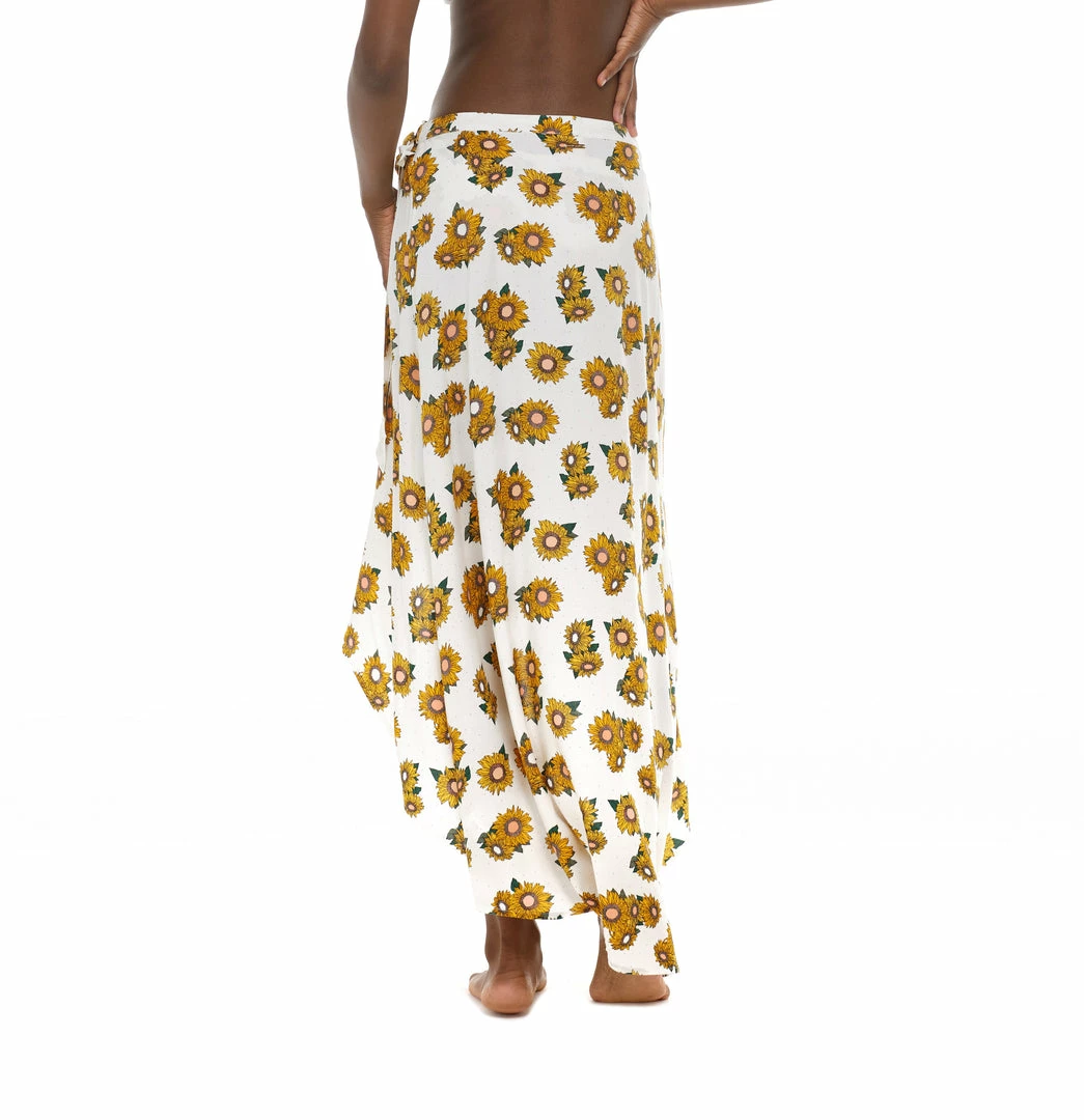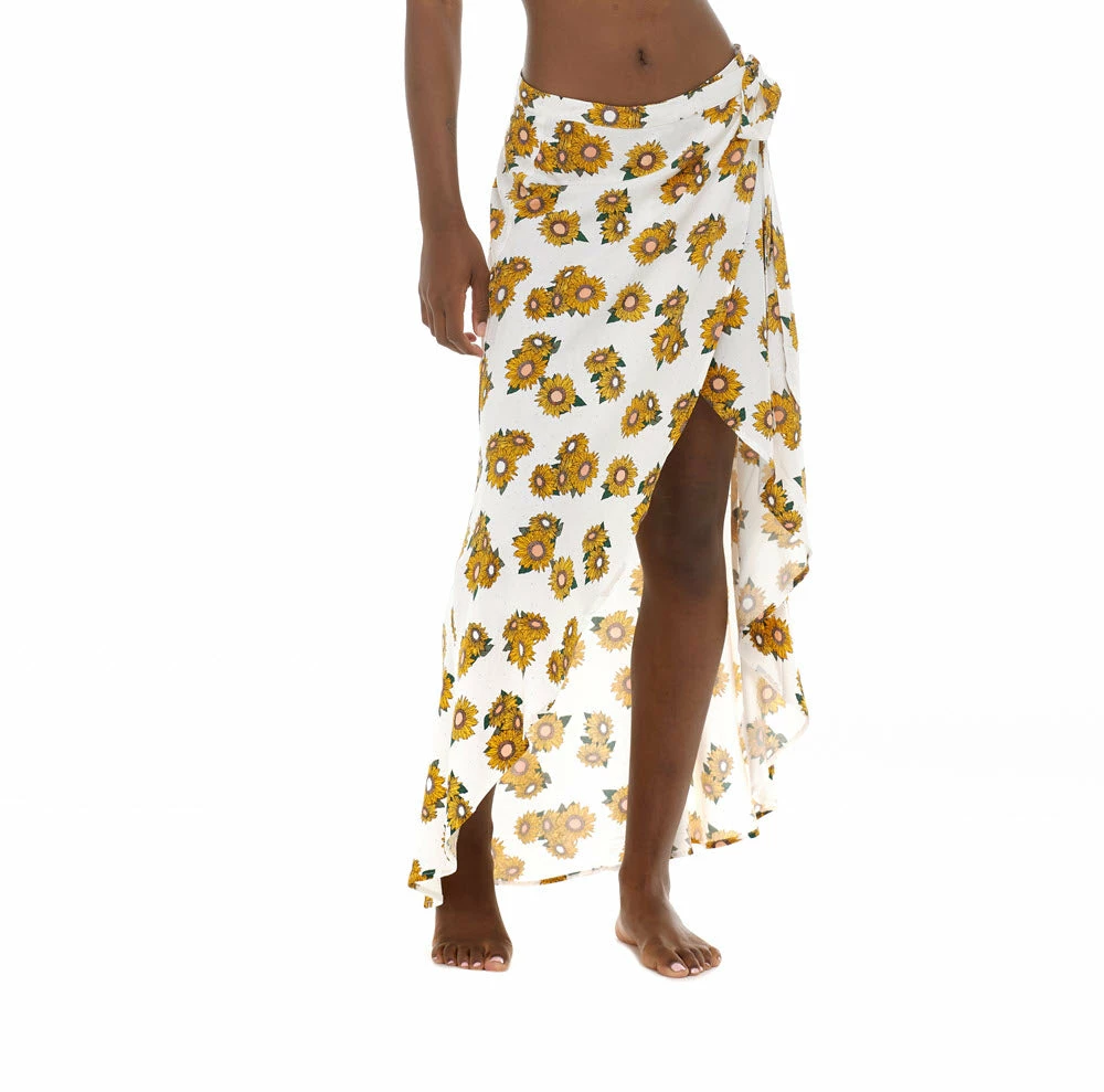 Lean into good vibes and sublime style with Lena, a high-low wrap skirt decked out in goldenrod flowers. Its sloping tulip hem is the definition of femininity and flow, tied together at the waist with a perfectly dainty bow. Whether paired with your favorite bikini top or a summery blouse, the Lena will have you looking like a total vision.
