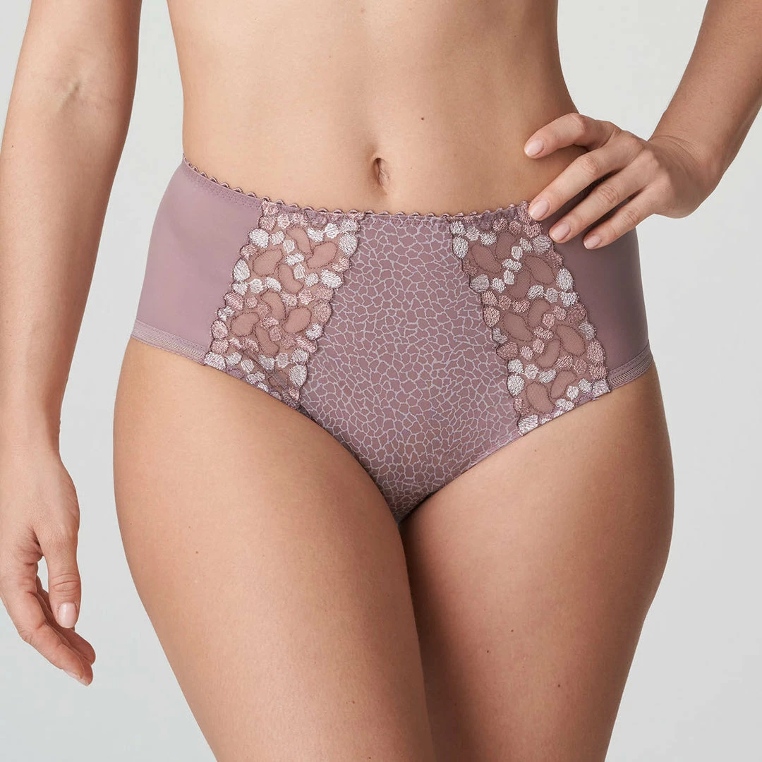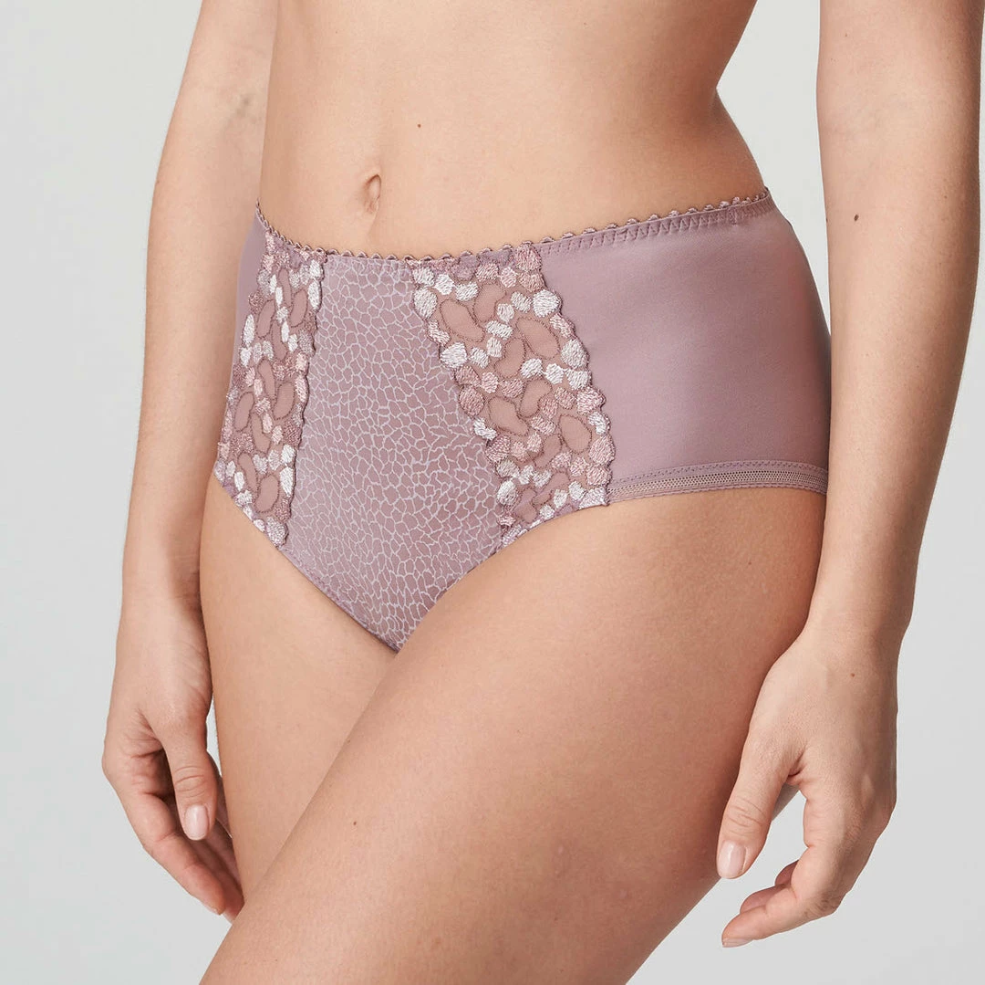 Feminine high-waist briefs in soft, printed fabric, with vertical embroidered inserts at the front. Sabia is a combination of romantic dusky pink and touch of soft taupe.