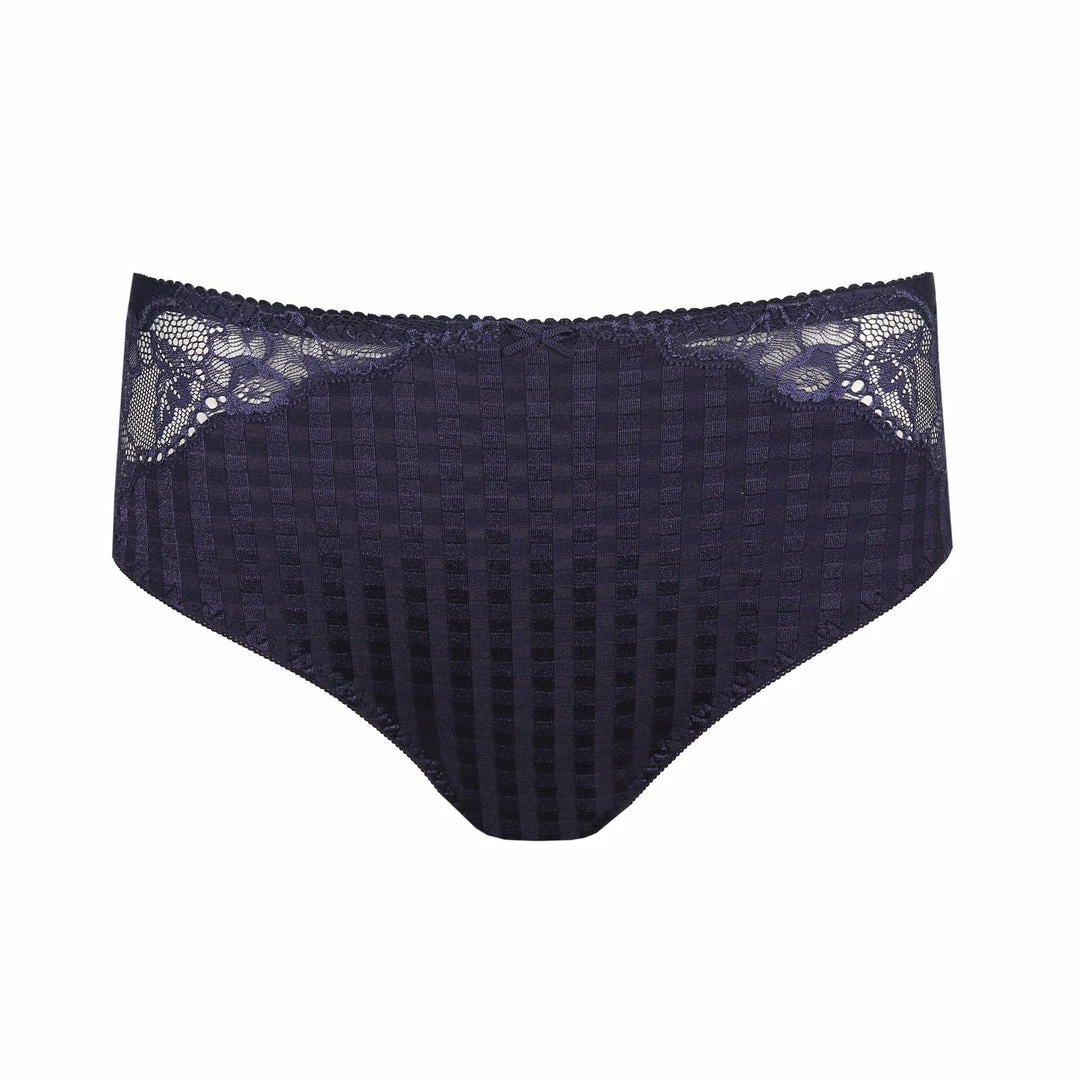 Elegant and comfortable high-waisted briefs in a gingham fabric with a luxurious lace trim at the legs. Dark blue Bleu Bijou is perfect for every skin tone and every occasion.
