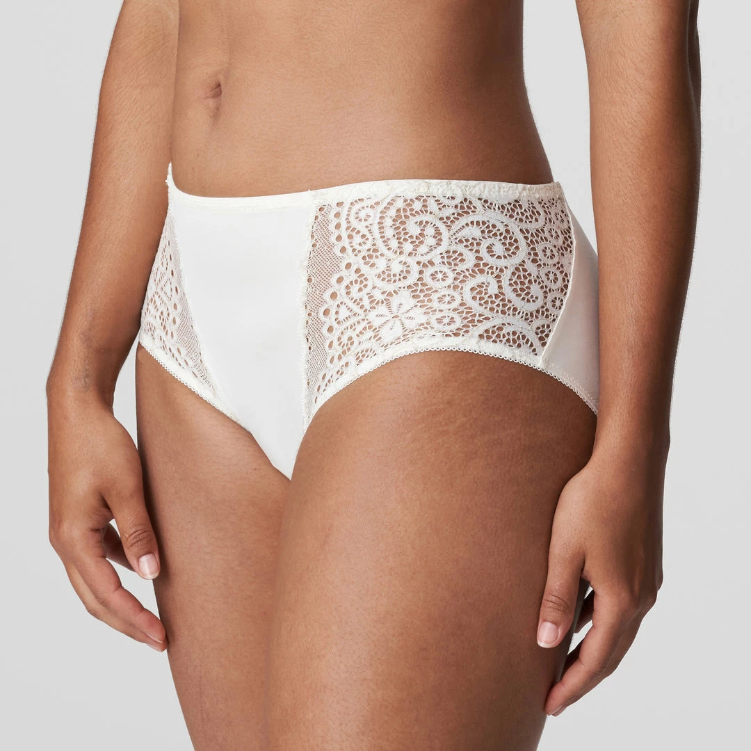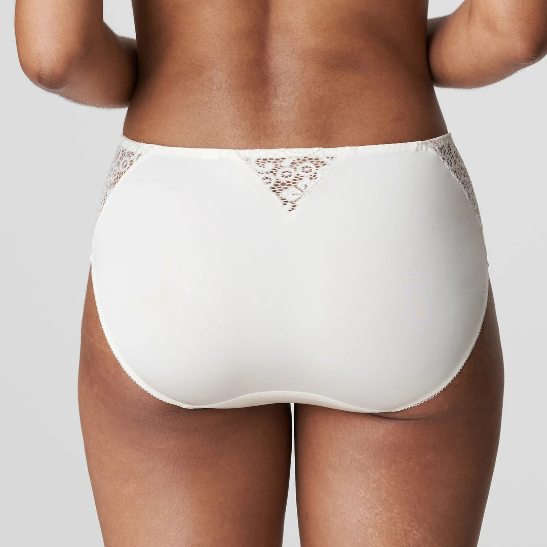 Vintage high-waisted briefs in a shimmery satin fabric with trendy nineties lace on the back and side panels.