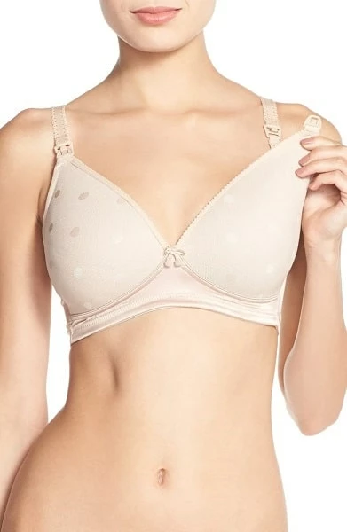 This cute and comfortable nursing bra is ideal for the smaller cup sizes and has a very smooth profile. The refined polka dot mesh lace paired with stretch satin provides comfort with a plunging neckline.