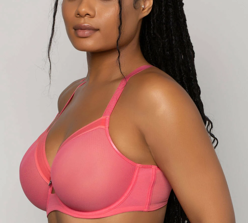 Our sexiest bra to date, this sheer mesh style is an everyday bra with two layers of sheer mesh molded cups. A plunging stretch neckline detail offers perfect contoured coverage. It’s a great option for the full-figured woman who likes a natural bust shape. The exceptional fit & support you know and love from Curvy Couture, this plus size sheer unlined bra gives you sexy & comfort all in one! Sheer see-through unlined cups with two layers of mesh