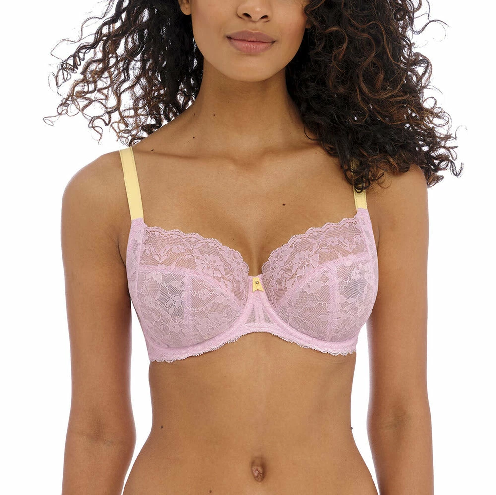 Contrast is key in Freya’s Offbeat Side Support Bra in Macaron. The back straps give central pull through the straps to prevent slippage whilst the center front bow with silver press stud detailing completes the look.