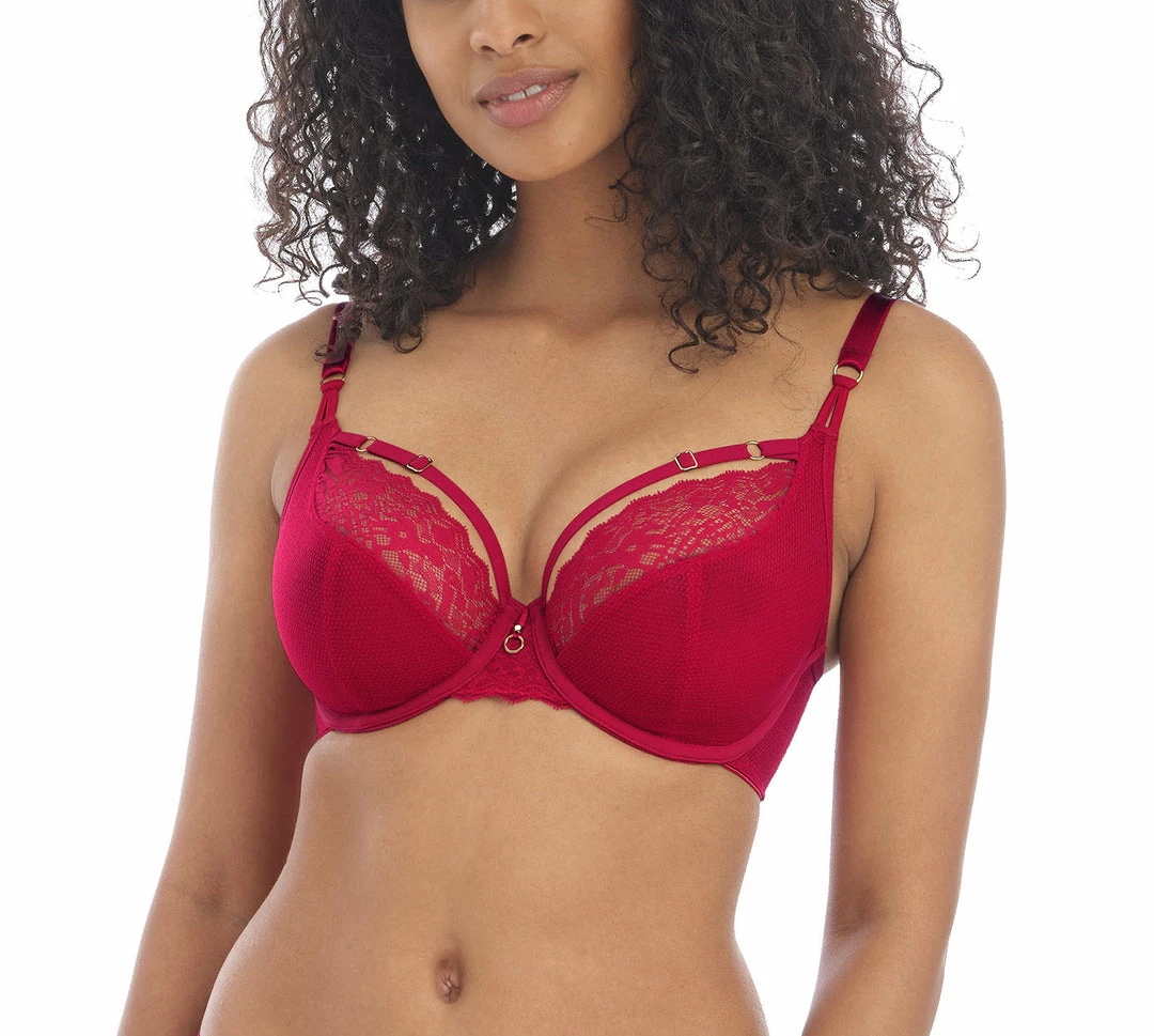 Put the cherry on top of any lingerie look with Freya’s Temptress Plunge Bra, a low center front design with intricate strapping detailing and a plain powernet wing for anchorage and support, finished with gorgeous bow detail with metallic gold trim at the center front.