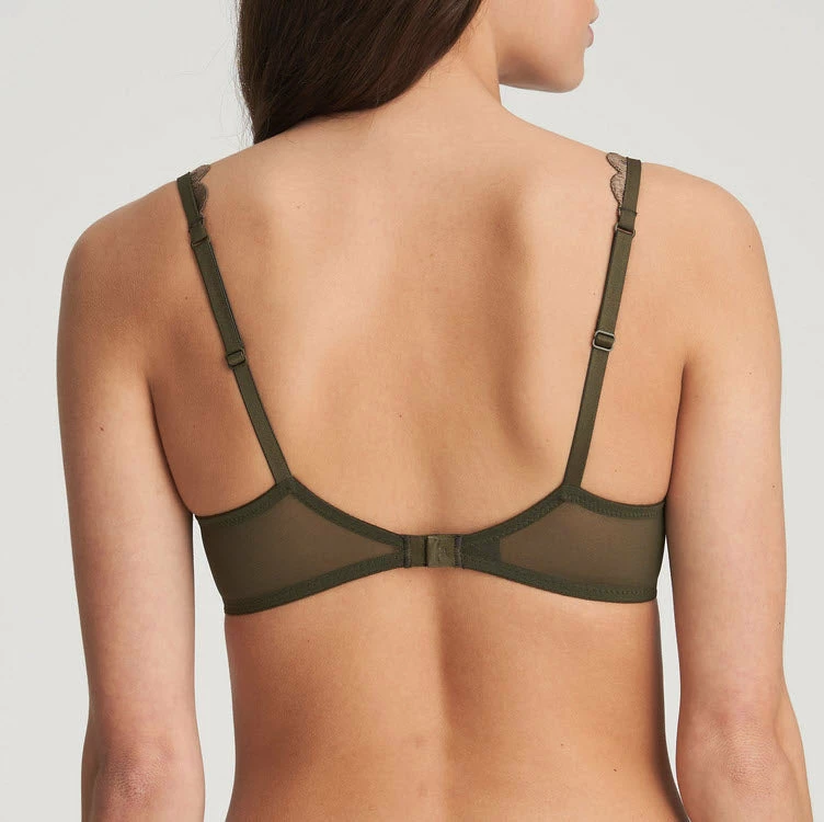 This beautiful Olive-green Phoebe bra by Marie Jo has just the right amount of padding with a Soft lace finish on the top of the cup to give great cleavage. The cup lays smoothly against the breast for a mostly seamless look. “Phoebe” has just the right amount of sophisticated golden sheen embroidered on the cups to make it beautiful as well as comfortable for every day.