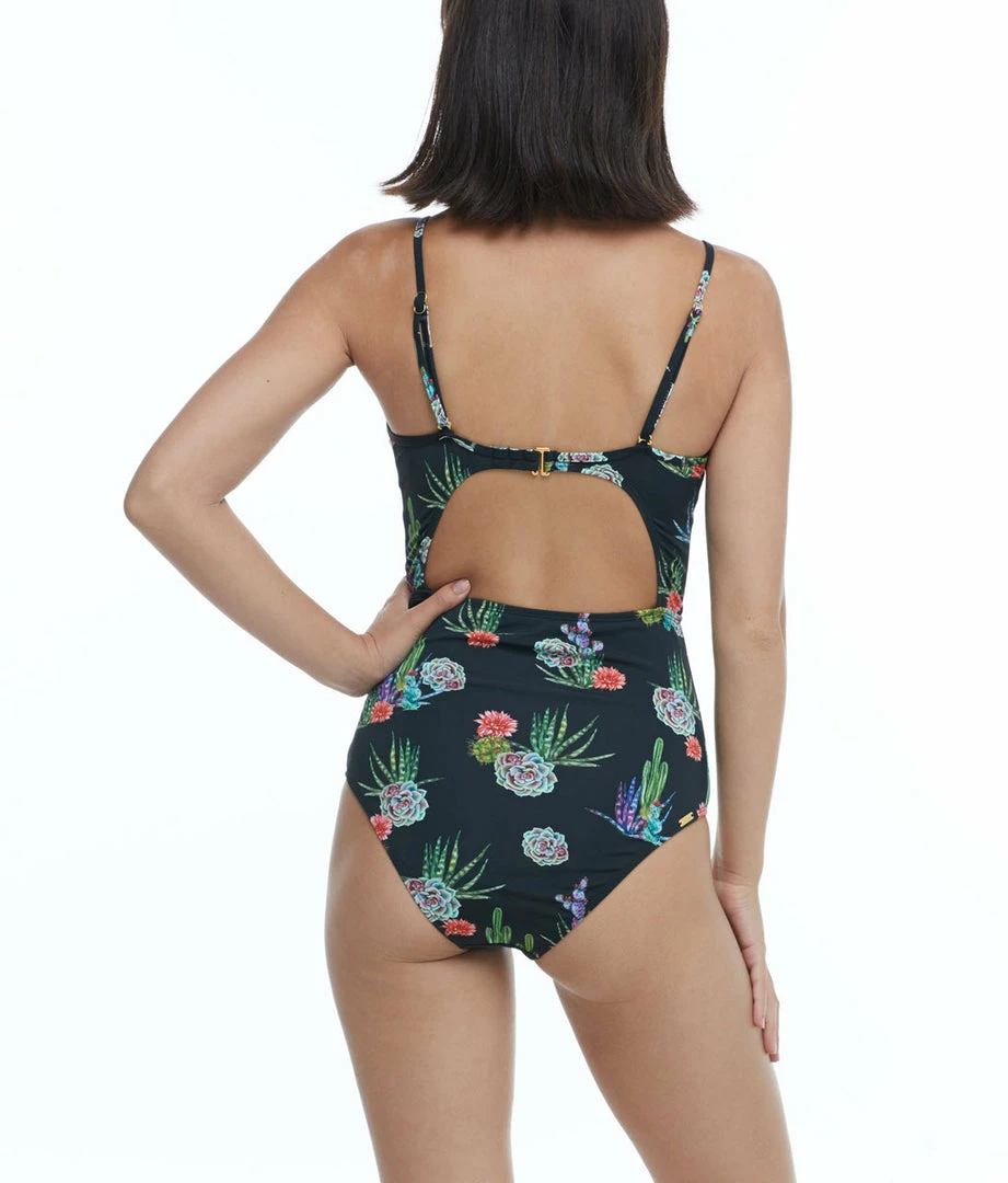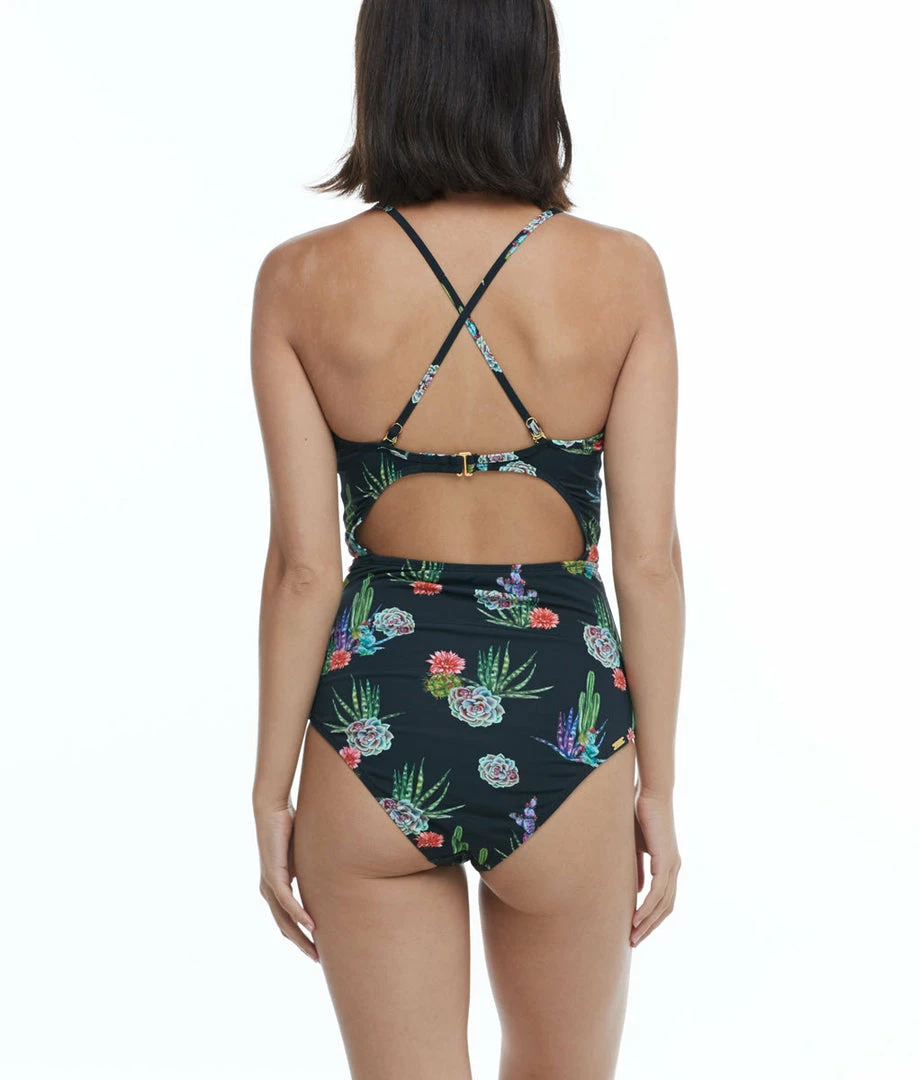 This one-piece’s design is bikini-adjacent, with flirty cutouts in the front and back. It also features a cinched tie at the bust, 2-way adjustable and detachable straps, an adjustable hook back, and mid-coverage on bottom.