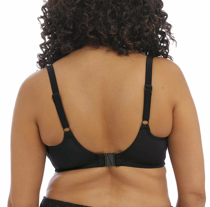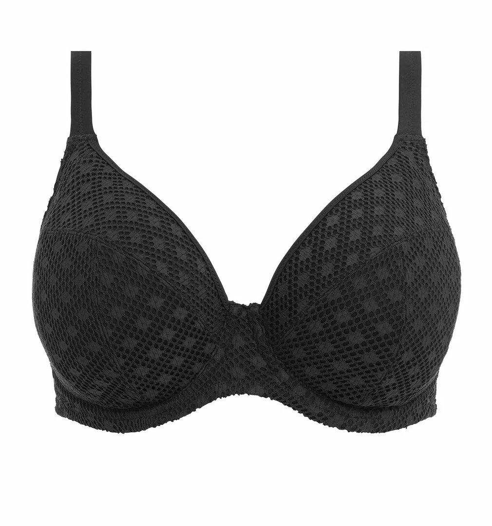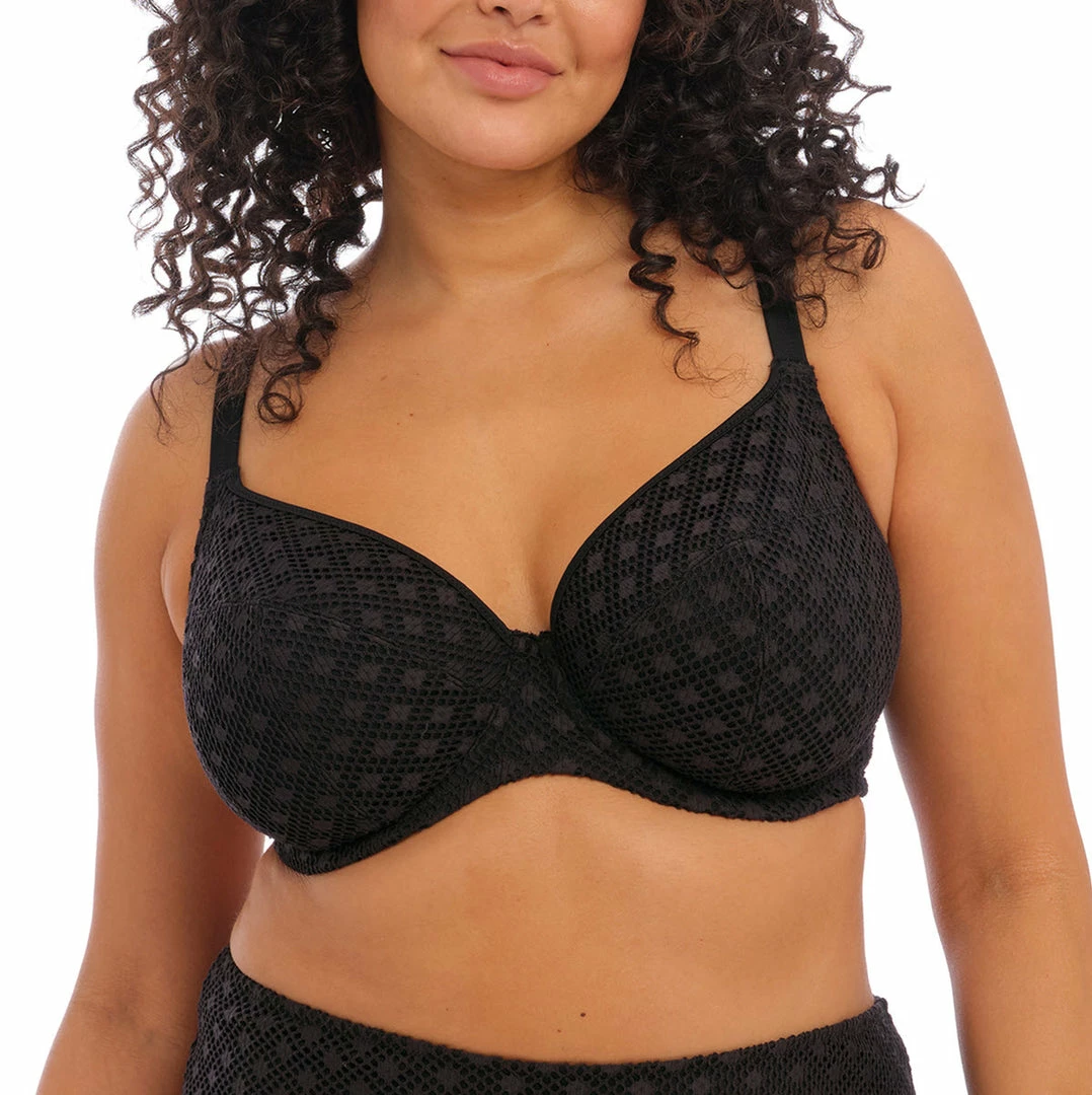 Discover Elomi’s Bazaruto Plunge Bikini Top in a Black hue. Based on the Essentials ES7504 UW Plunge Bikini Top frame plus, a delicate crochet fabric overlay, fully lined and a powernet back lining for extra support.