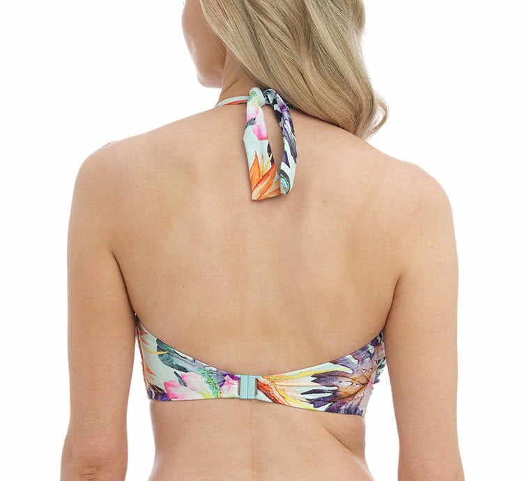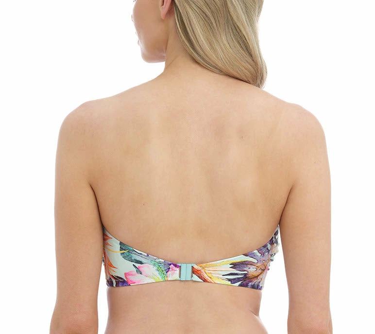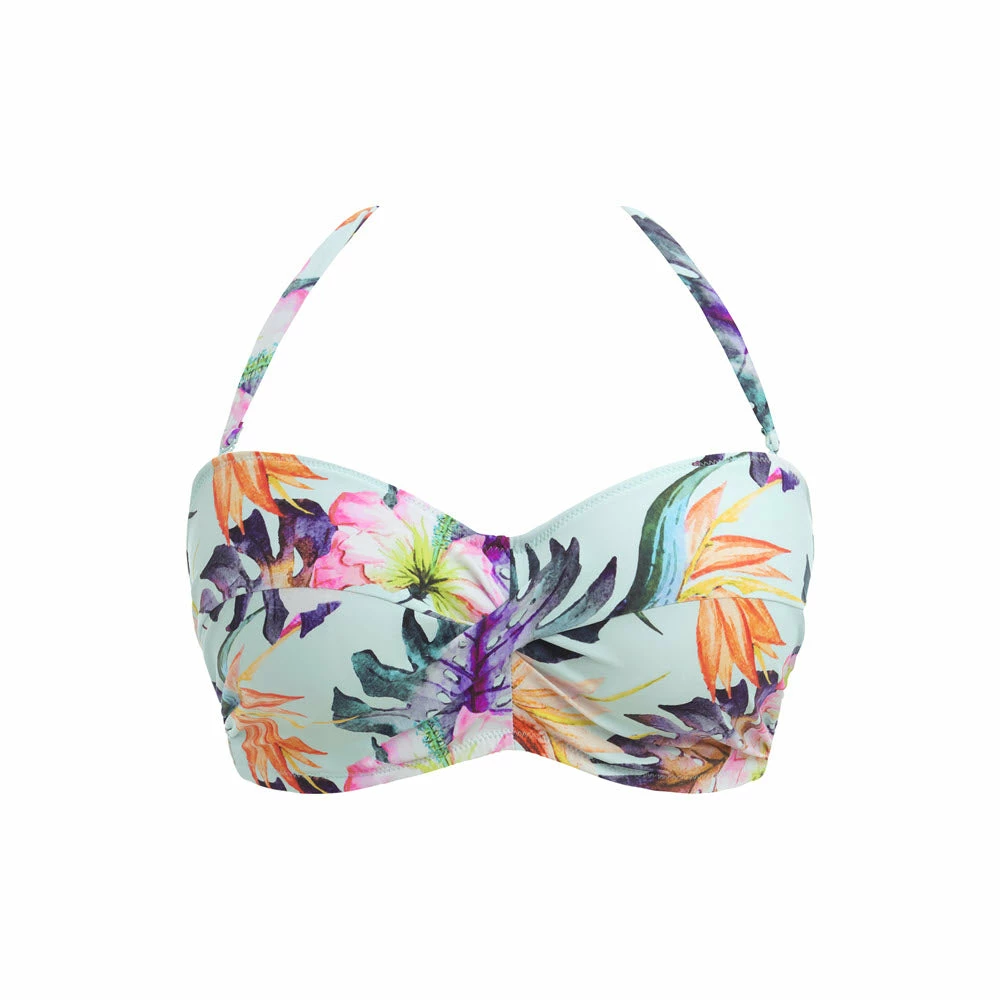 Make a statement on your next getaway with Fantasie’s Paradiso Bandeau Bikini Top, showcasing a print of lush birds of paradise flora against a contrasting Soft Mint ground. Lightly padded cups ensure support and a round profile, while the twist front detail gives a flattering sweetheart neckline.