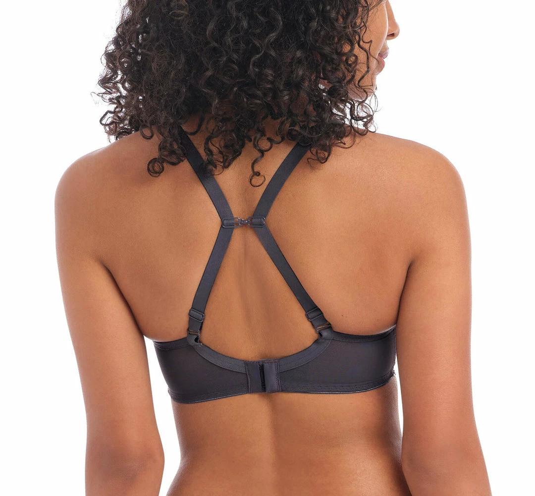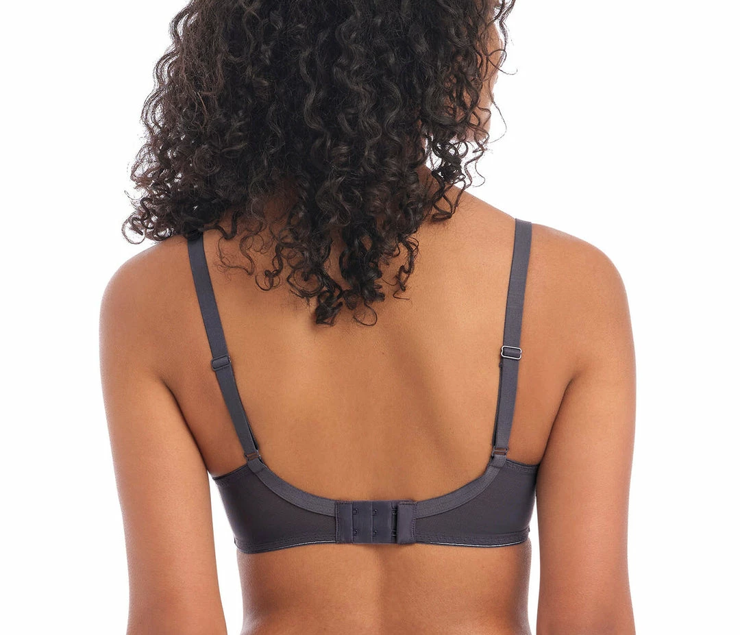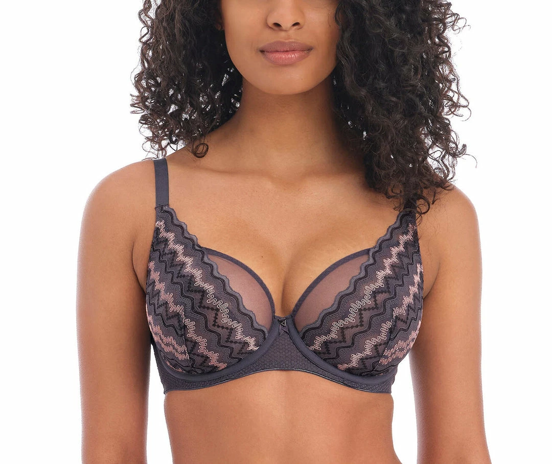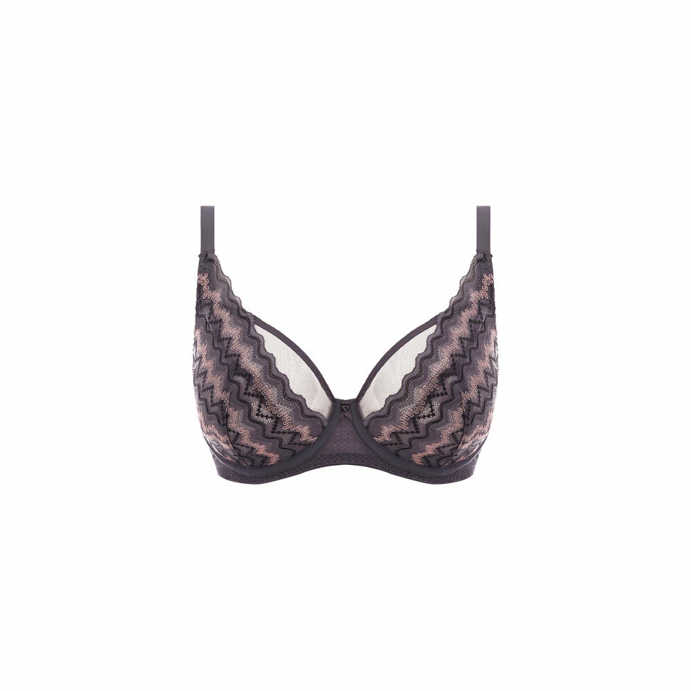 Make a statement in Freya’s Festival Vibe High Apex Bra in a Cinder grey colourway, designed with semi-sheer top cups, alongside a chic geometric zigzag design cup. The high apex shape offers a flattering low cut neckline, finished with pretty ribbon and triangular metallic details