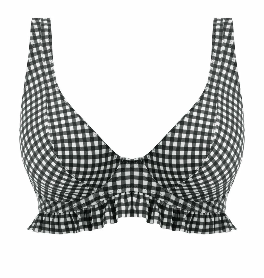 Gingham has never looked so good styled on Freya’s ‘Check In’ High Apex Bikini Top. Elongated apex works to achieve a flattering low plunge neckline, whilst lined cups provide shaping and support, complete with a playful frill detail to the bottom of this Summer-loving piece.