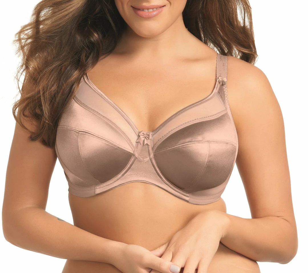 Full coverage underwire bra featuring satin simplex cups with sheer top for a lighter look. Maximum lift and support is provided by side slings and 4-part cups