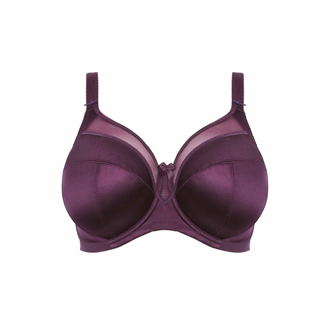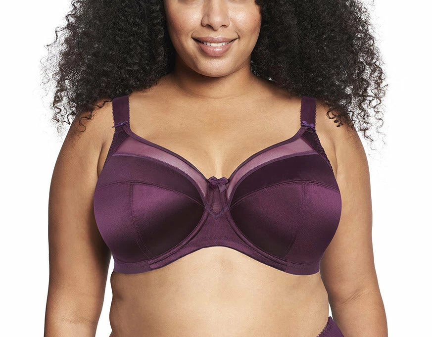 Full coverage underwire bra featuring satin simplex cups with sheer top for a lighter look. Maximum lift and support is provided by side slings and 4-part cups.
