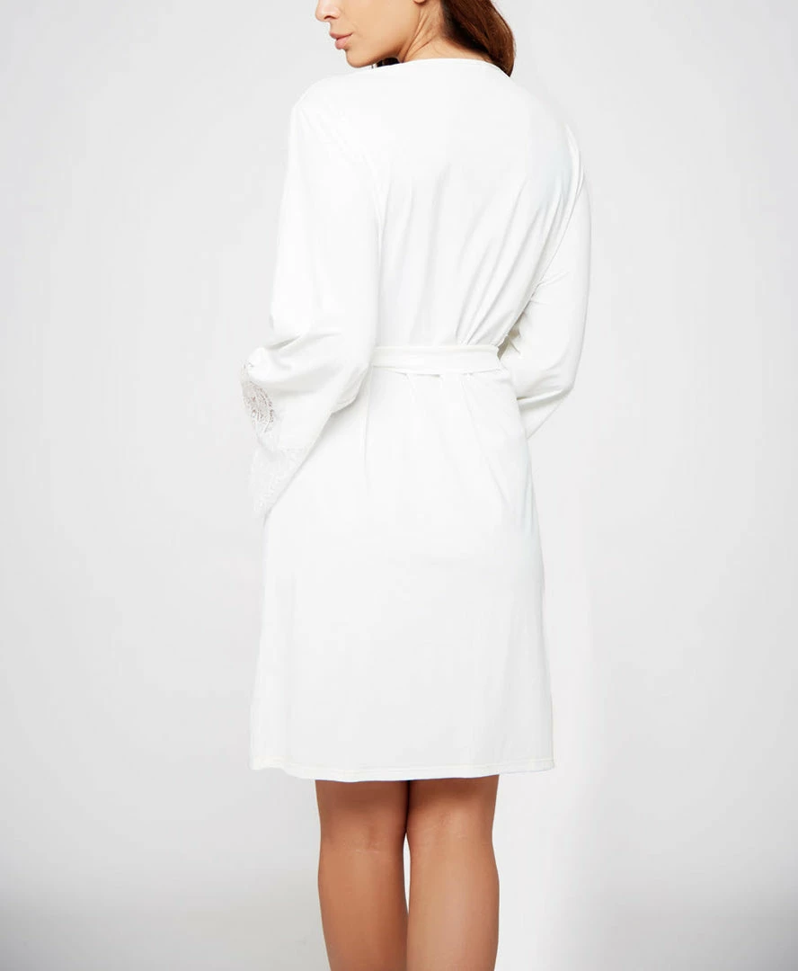 Looking for a white robe to add to your lingerie collection? Try this soft lycra stretch robe with triangle lace detail and removable waist tie.