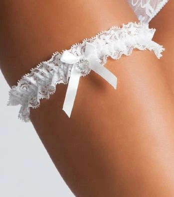 This garter is adorned with a satin bow and rhinestone accent.