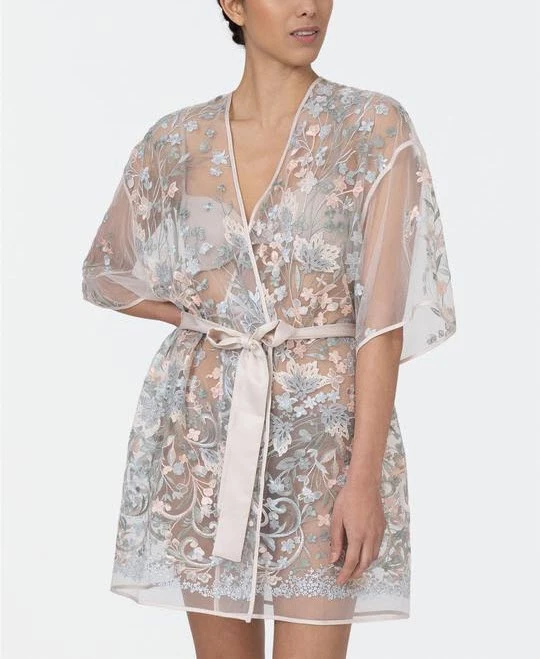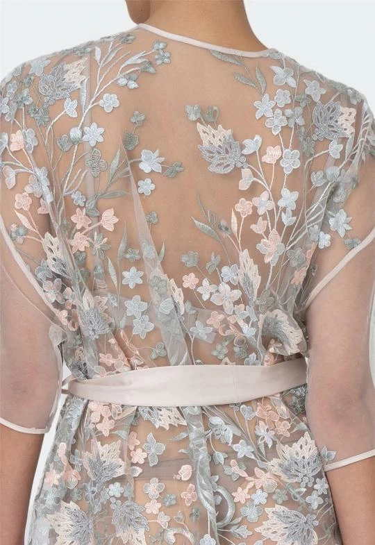 Welcome romance into the season with the unique coloration and impeccable fit of the Iris Cover Up. This versatile piece features embroidered mesh and a lustrous poly charmeuse belt.