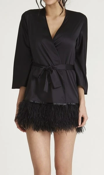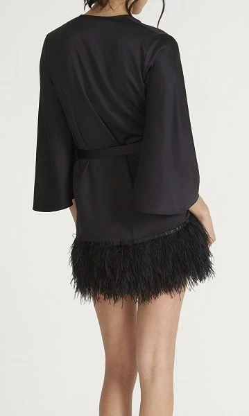 This lustrous poly-charmeuse cover up robe creates a flirtatious feel thanks to the beautiful ostrich feathers around the bottom hem.
