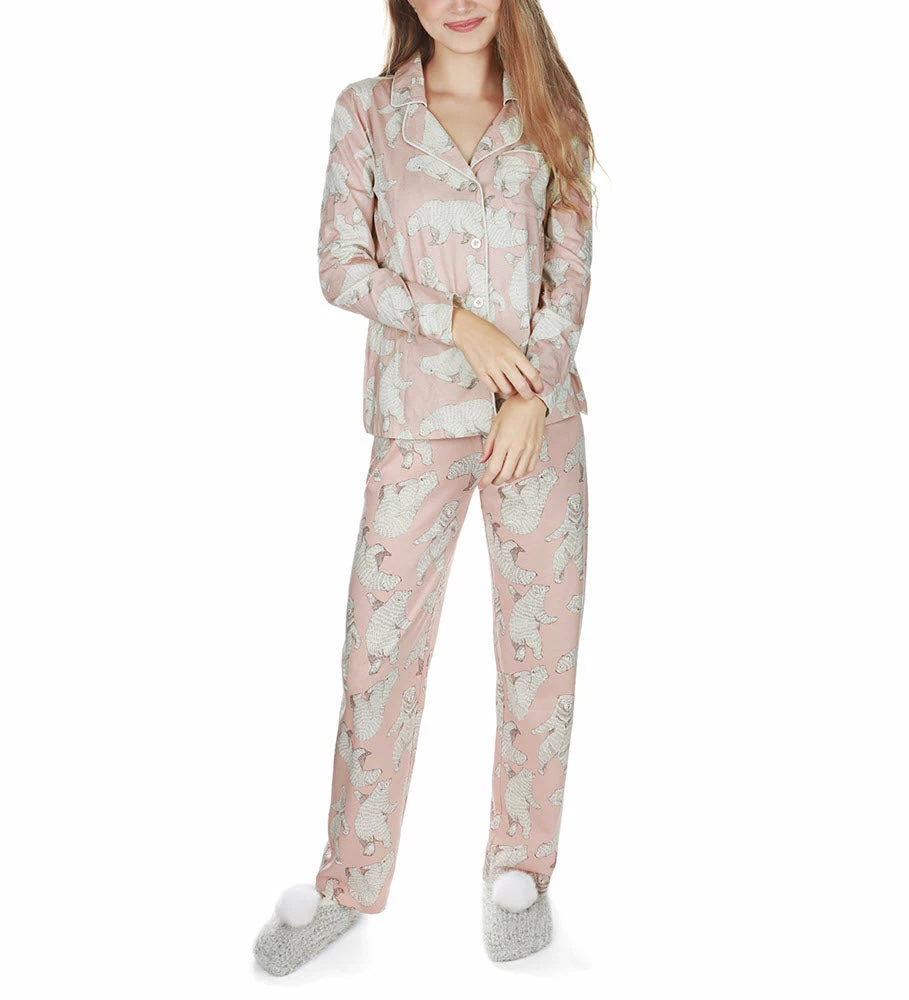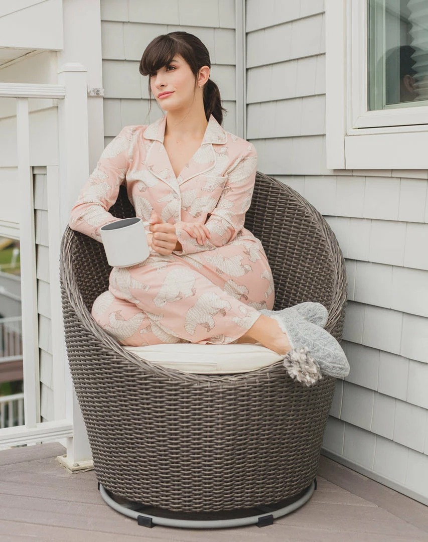 Can you bear such adorable pajamas? The Notch Collar Polar Bear PJ Set is so comfortable you’ll want to hibernate in it! Lightweight fabric feels gentle against the skin for sleep that won’t be interrupted by heavy material or constriction. Complete with matching tops and bottoms available for a wide array of body sizes and shapes, you’ll look your coolest in all over polar bear print.