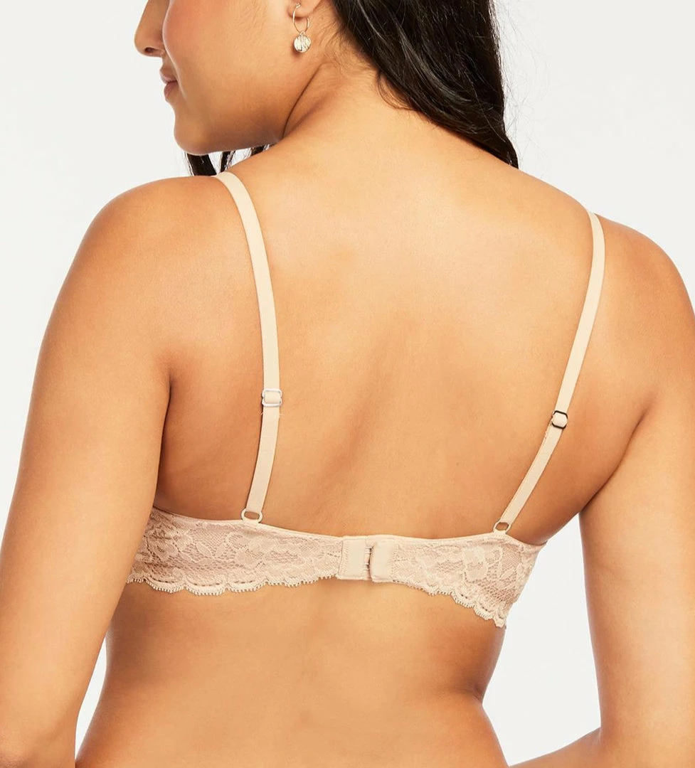 The Flirt lace bra is a sexy must-have! This lightweight bra features a smooth stretch mesh for support. It is the perfect pair to a sweetheart or low round neckline. Now available in this beautiful light sand color which is a gorgeous neutral for under lighter color tops.
