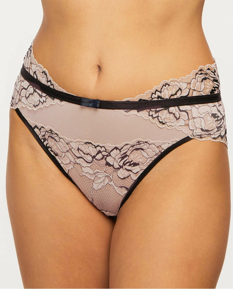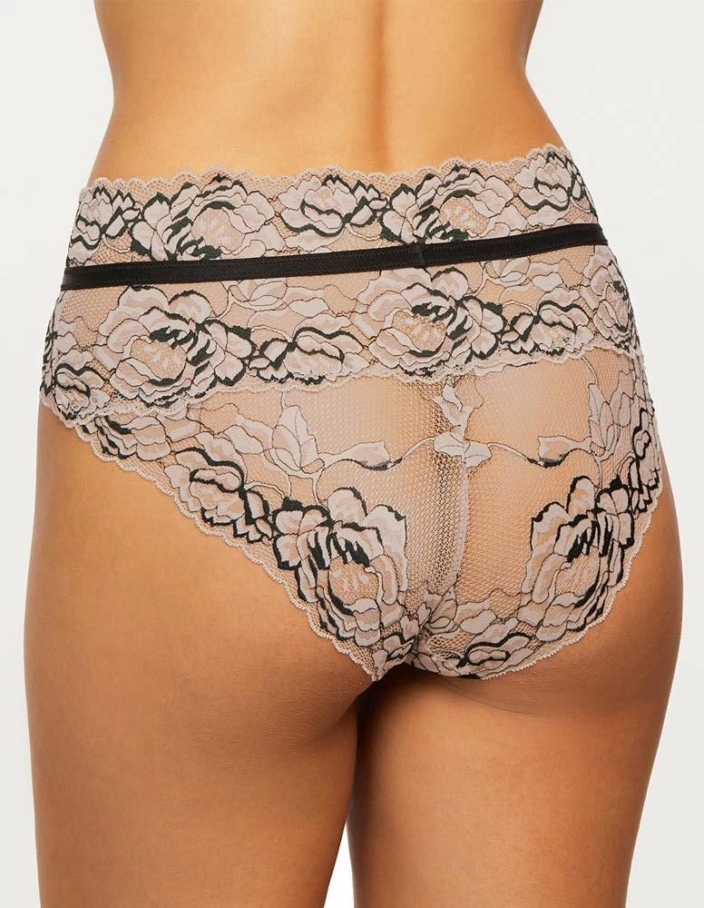 Coverage and charisma come together in this High Waist Brief. The two-toned floral lace brings an air of nostalgic romance to the look, made bold by the black batwing bow accent and shiny facing elastic detail at the waist.