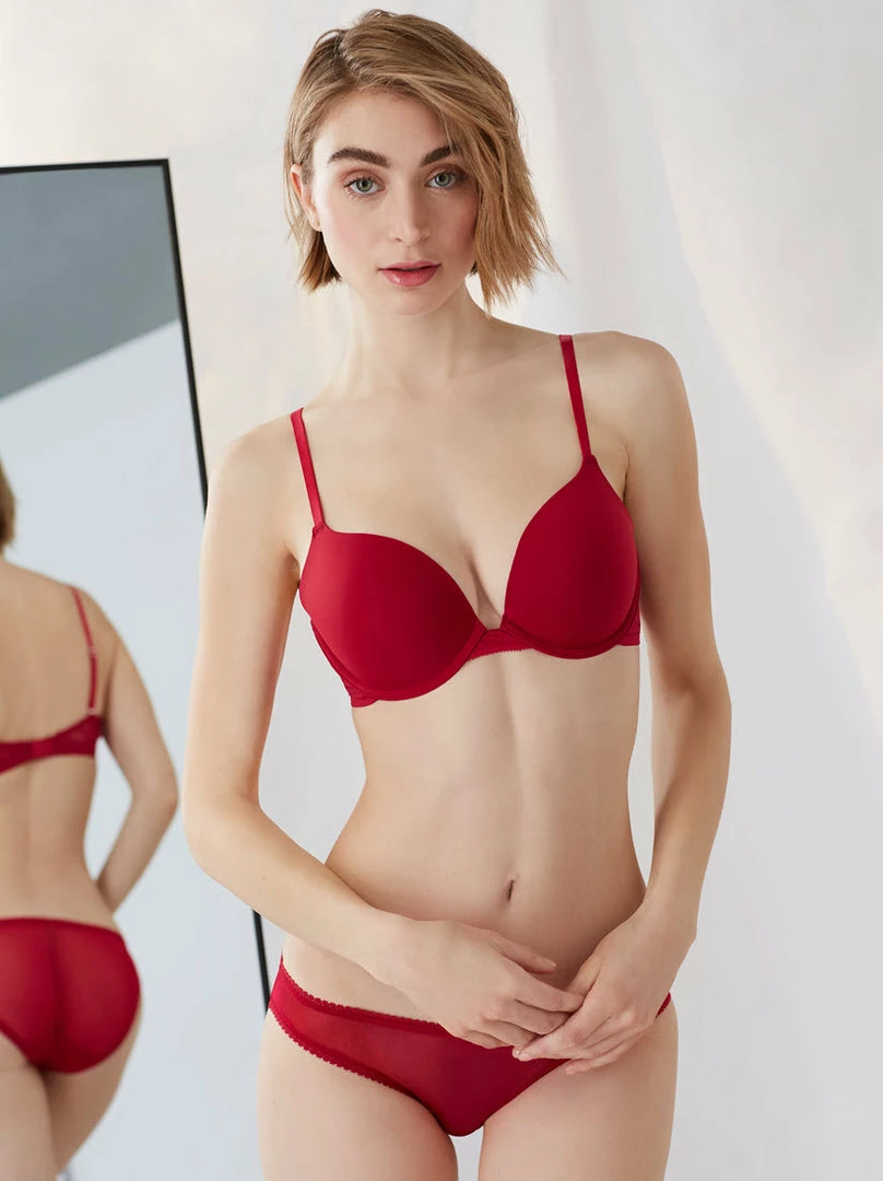 - Lace detailed push up with plunging neckline Smooth microfiber molded cups