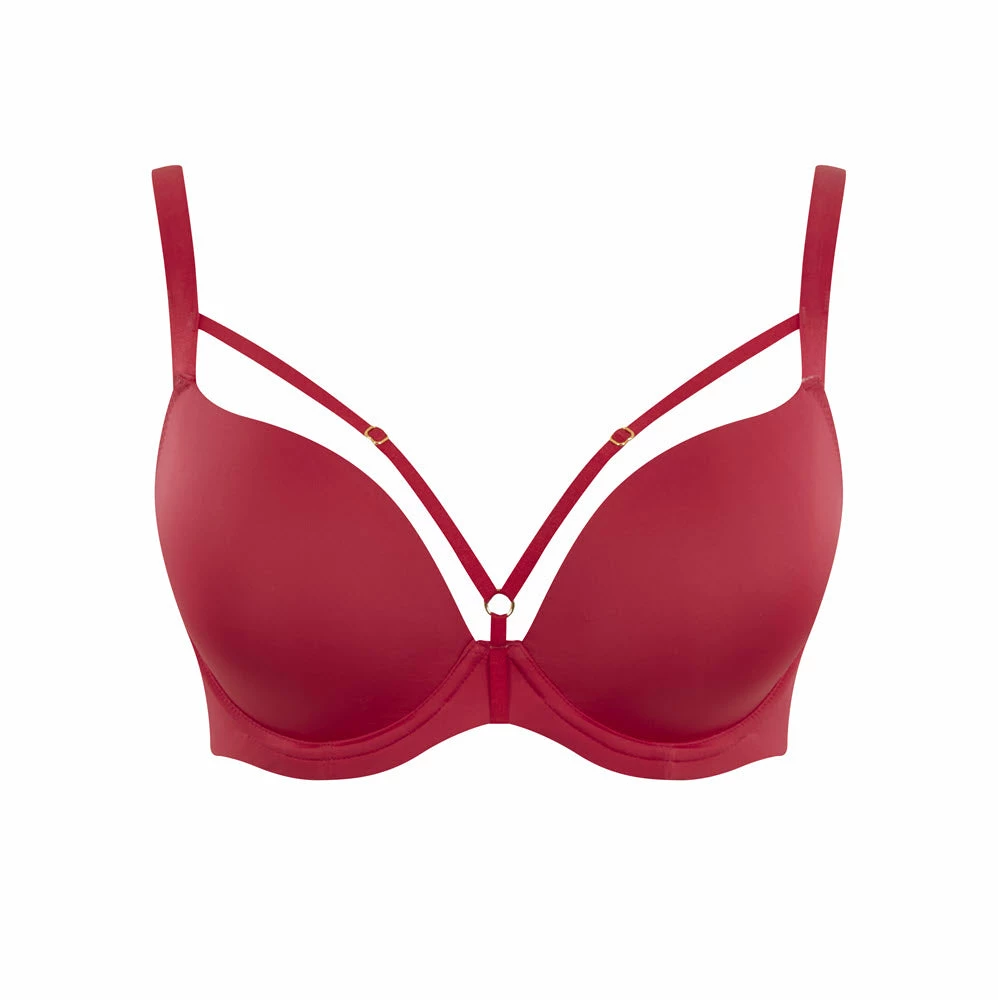 This style is the perfect day to night piece. Boasting slim cage style straps that draw the gaze to your curves, this bra can add sexy detailing to lower cut outfits. The beautiful hardware adds a chic feel to this style. The plunging neckline further highlights your curves which are accentuated by the padded cups. Soft molded cups help define your bust giving you a smoother, more rounded silhouette. The underwire offers a natural lift and all-day support. Make it a set with the brazilian matching panty!