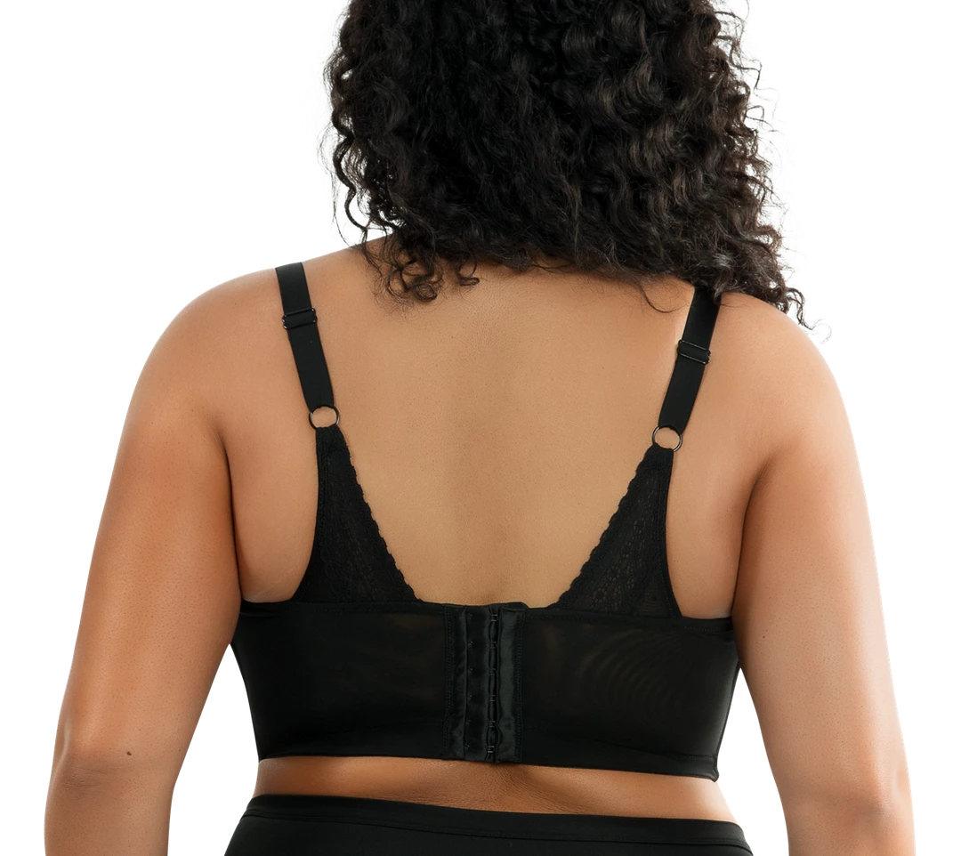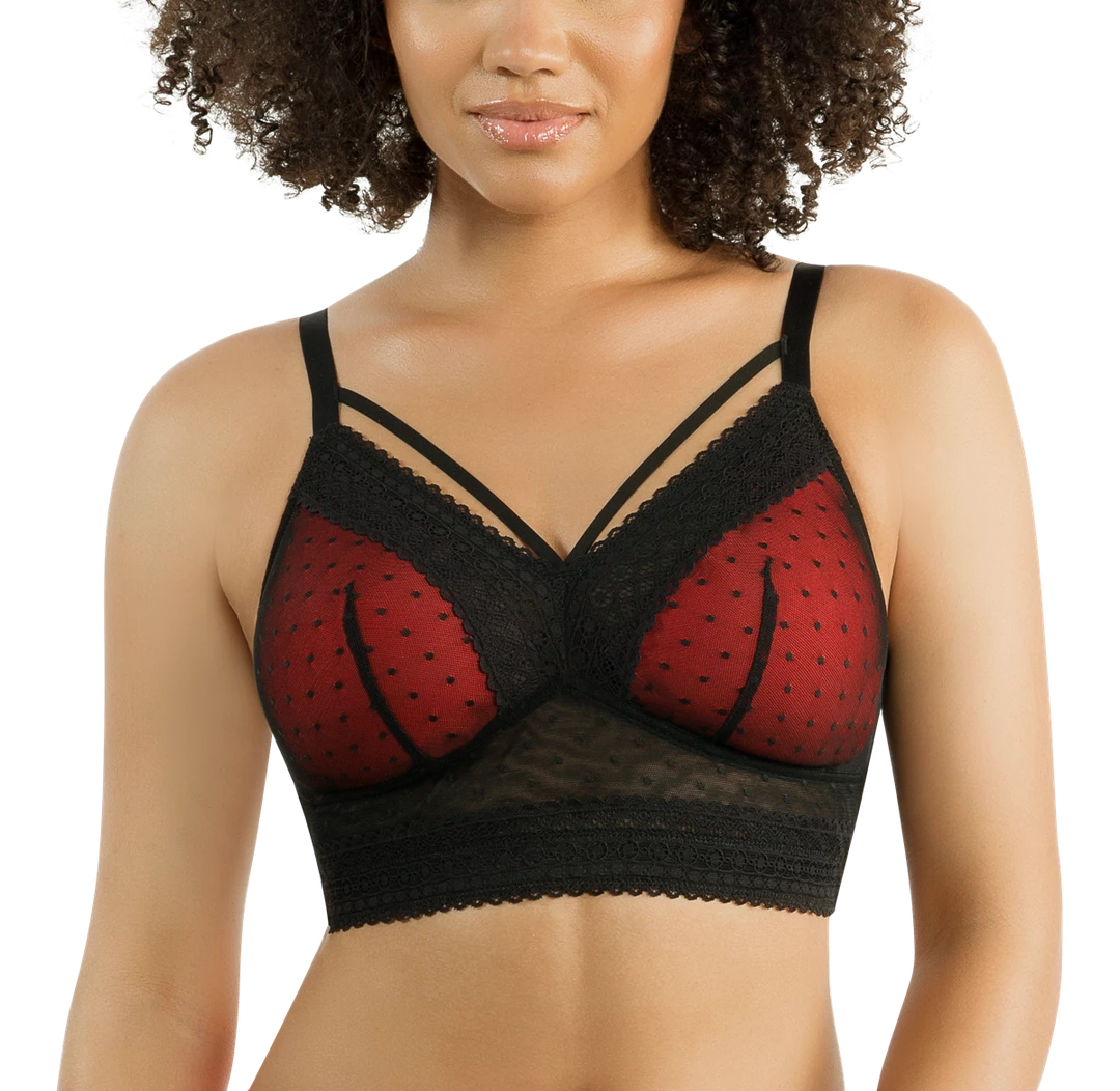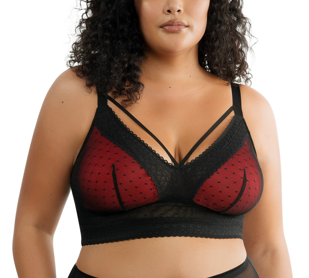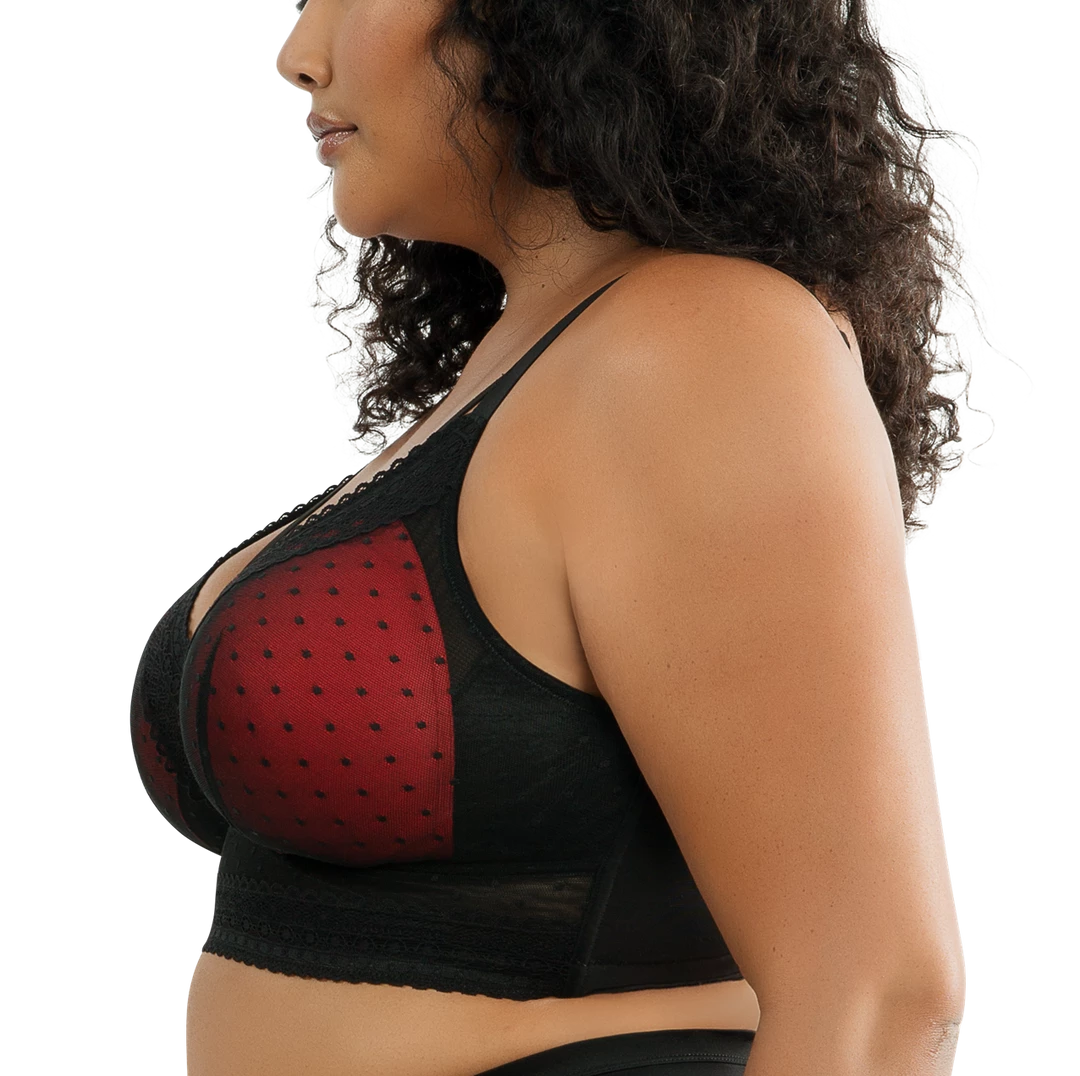 Sexy and comfortable, our Mia Dot bralette features wire-free cups with removable and reversible padding with mesh dot lace fabric on the cups. The front straps add a sexy feel with multiple hook and eye back closures to helps smooth. Mia Dot bralette features wire-free cups with a longline design to help smooth and add additional support. Front strapping adds a sexy appeal.