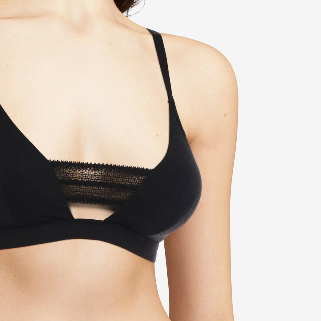 - Cup in soft graphic knit with lace detail across center front