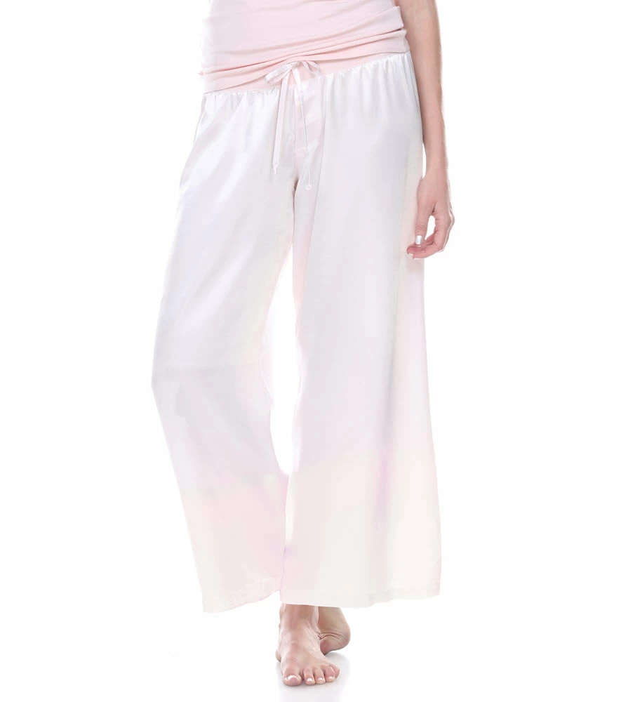 This palazzo satin pant has a knit waistband with a drawstring. It can be worn as a capri pant for taller customers and a full-length pant for petite customers.