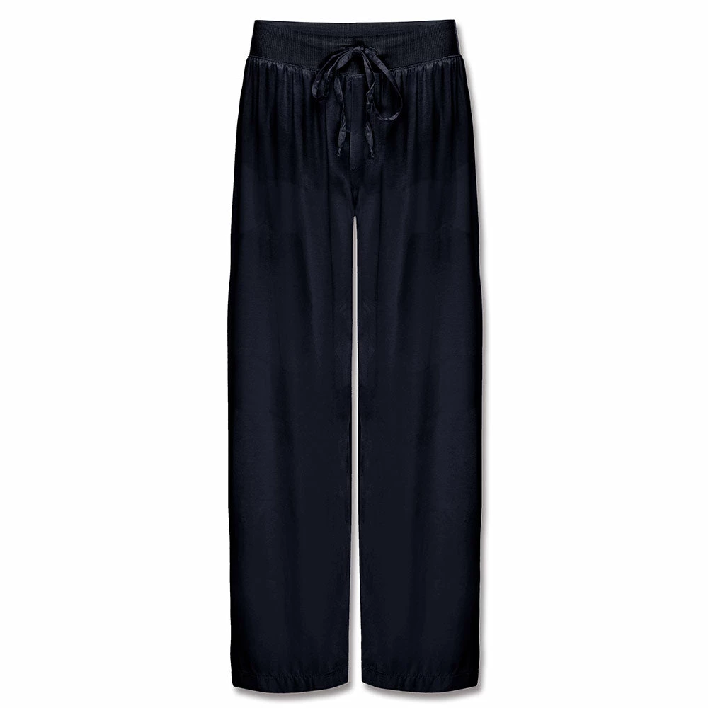 This palazzo satin pant has a knit waistband with a drawstring. It can be worn as a capri pant for taller customers and a full-length pant for petite customers.