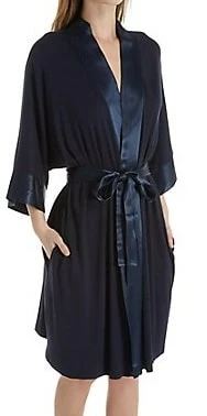 The Shala Kimono is a beautiful blend of buttery knit with a satin trip and sash. The sleeves are three-quarter length and the robe features pockets.