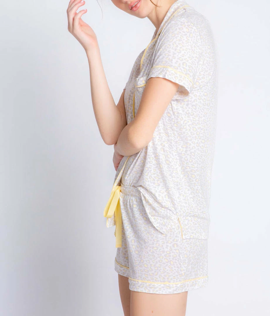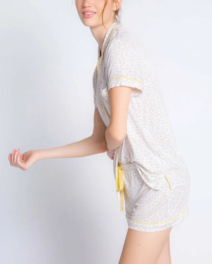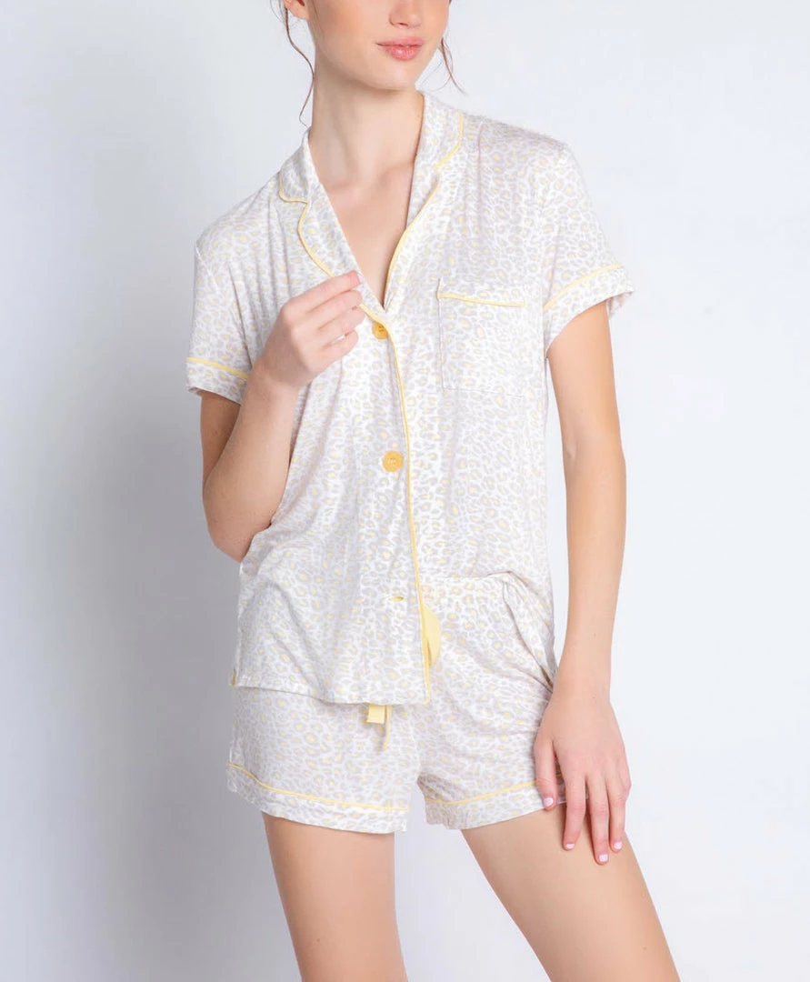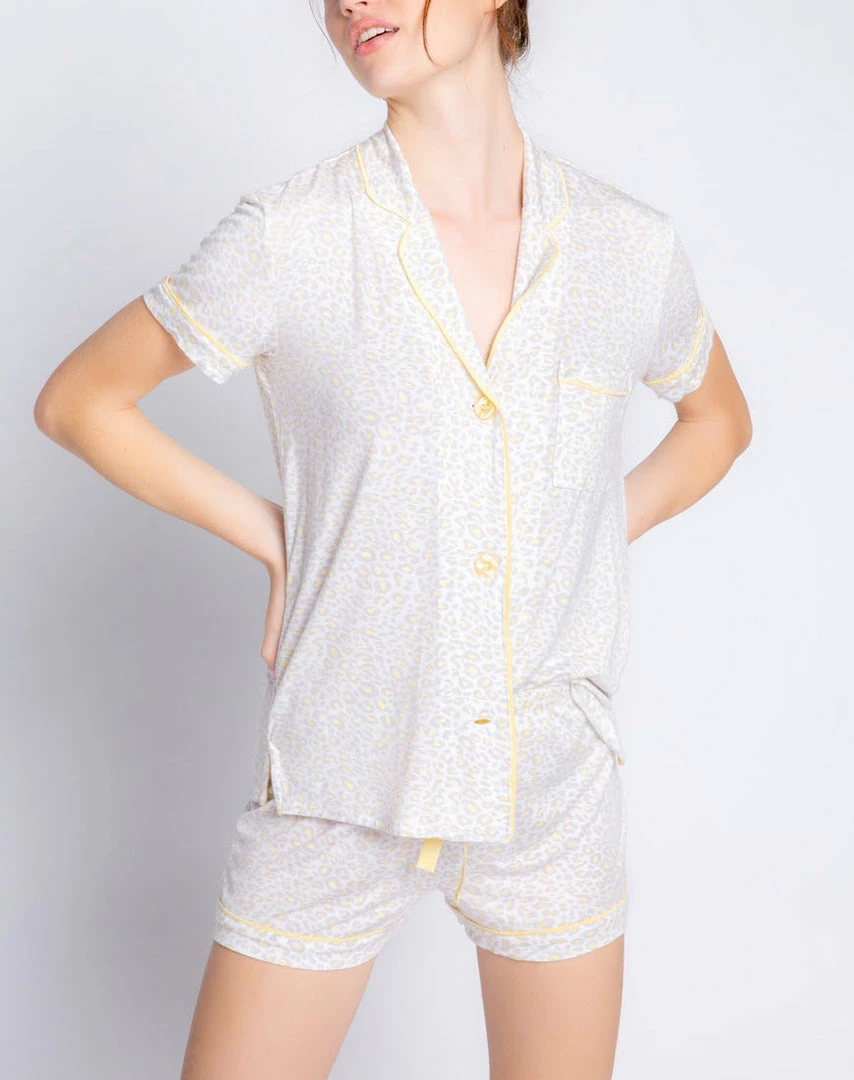 This short and button-down short sleeve modal set is sure to be your new go to lounge set! This subtle animal print has the perfect “Sunburst” pop of yellow.