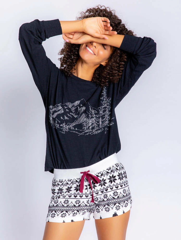 Lounge around this winter seaason in the ultra cozy Ski Club collection by PJ Salvage this year! The sily velour feels best on the chilly winter nights. This collection has a wintery ski-fair isle print and looks great on with the matching piece and some cozy socks or slippers!