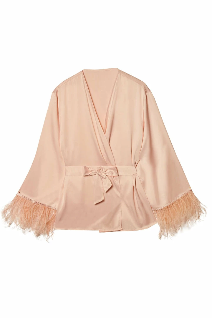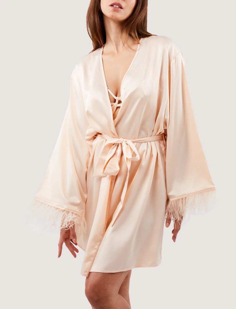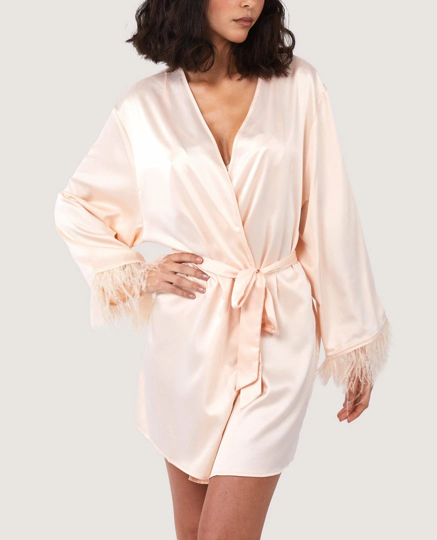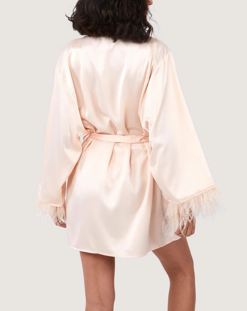 This is going to be your new go-to robe for all things glam. With flirtatious feathers and a tie waist, this blush pink Feather Trim Robe is sure to turn heads. The ultra-smooth satin glides over your skin like silk, making it ideal for wearing alone or over sultry lingerie.