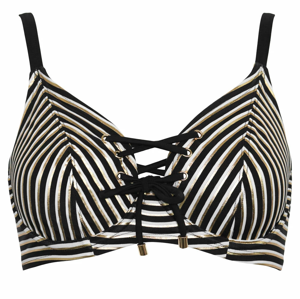 Sail off into the sunset with this bikini top in a timeless striped print. This underwired style from our Radiance collection will look fabulous all summer long. Styled with front rope lace up detailing this full cup bikini top will leave you looking fabulous and feeling supported.