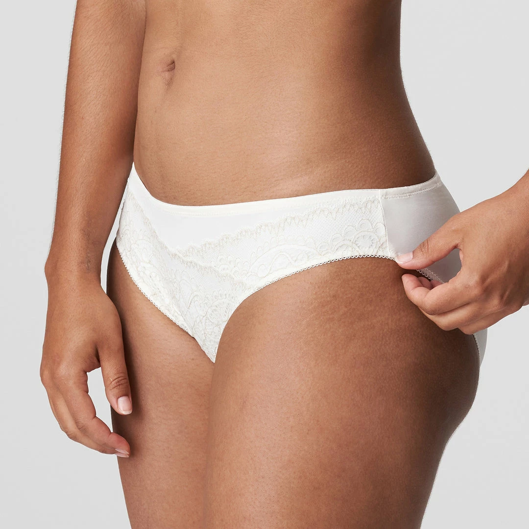 Trendy Rio briefs with lace in a fashionable nineties print. The back panel is made from shimmery satin fabric.