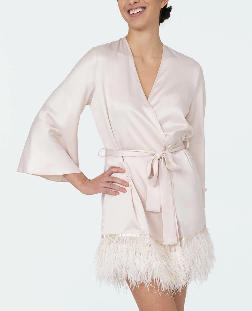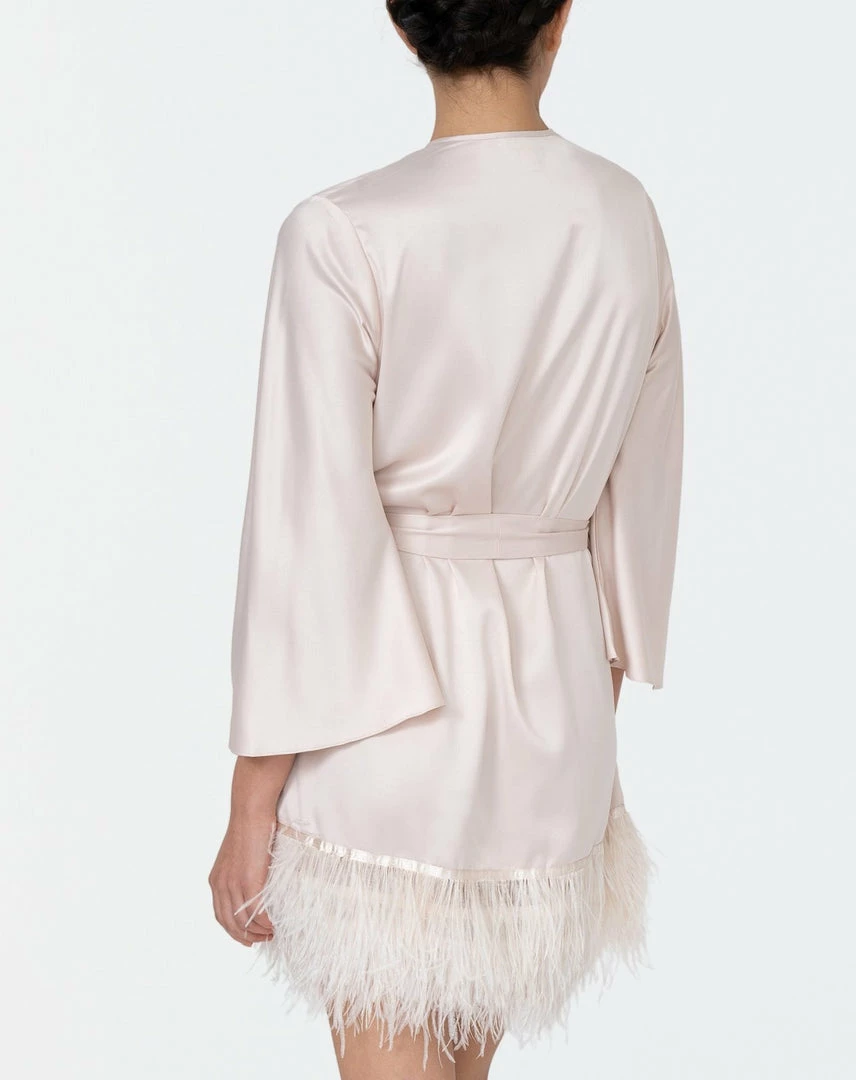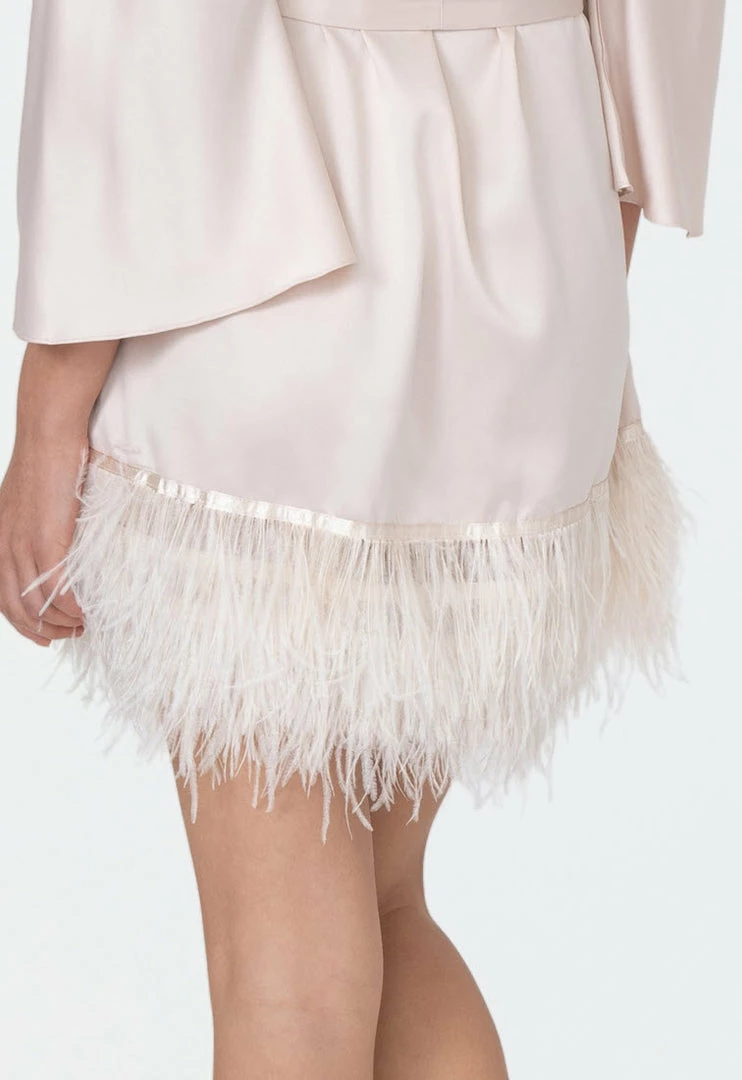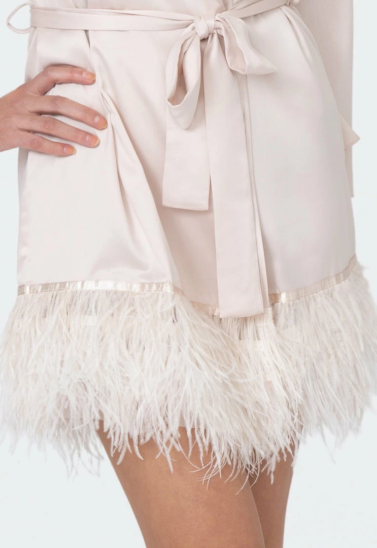This lustrous poly-charmeuse cover up robe creates a flirtatious feel thanks to the beautiful ostrich feathers around the bottom hem.