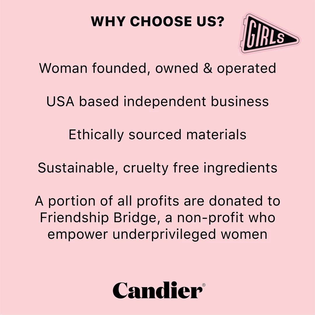 Made with 100% natural soy wax. Blended with essential oils and hand poured in the USA. Our candles are cruelty free, and contain no gross goop. No carcinogens, no parabens, no phthalates, ever. A portion of all our sales help empower underprivileged women worldwide by supporting the amazing non-profit Friendship Bridge.