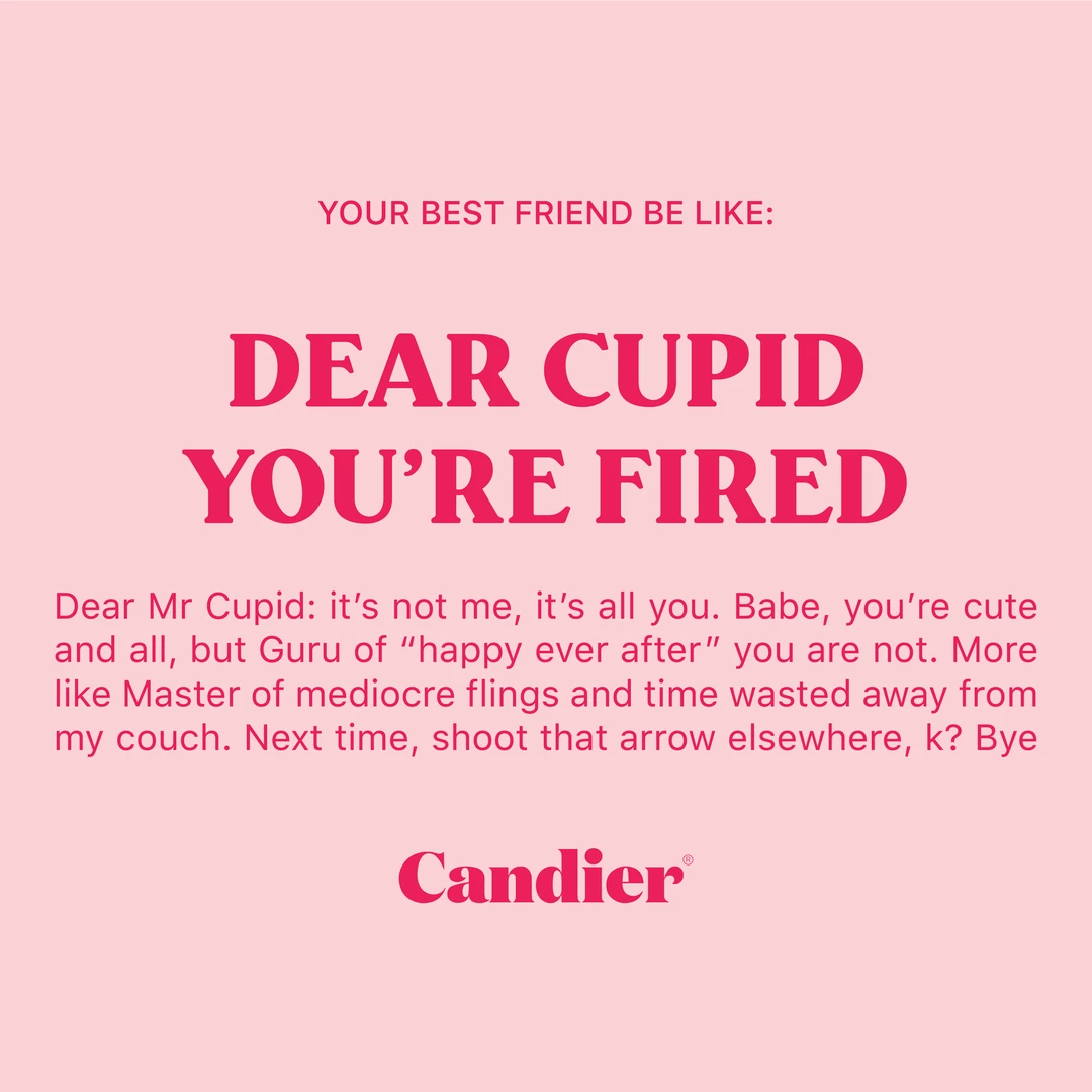 Dear Mr Cupid: it’s not me, it’s all you. Babe, you’re cute and all, but Guru of “happy ever after” you are not. More like Master of mediocre flings and time wasted away from my couch. Next time, shoot that arrow elsewhere, k? Bye! xo