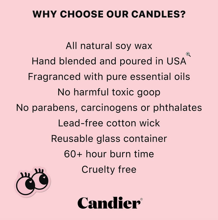 100% natural soy wax. Blended with essential oils and hand poured in the USA. Our candles are cruelty free, and contain no gross goop. No carcinogens, no parabens, no phthalates, ever! A portion of all our sales help empower underprivileged women by supporting the amazing non-profit Friendship Bridge.