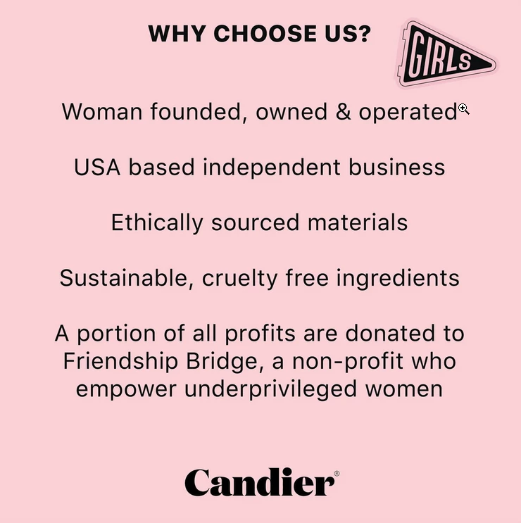 100% natural soy wax. Blended with essential oils and hand poured in the USA. Our candles are cruelty free, and contain no gross goop. No carcinogens, no parabens, no phthalates, ever! A portion of all our sales help empower underprivileged women by supporting the amazing non-profit Friendship Bridge.