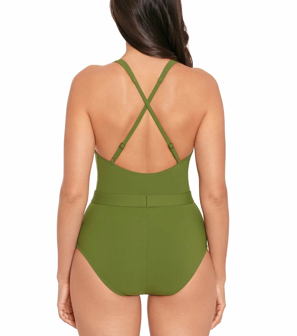• Deep plunge, attached stretch belt defines waist
