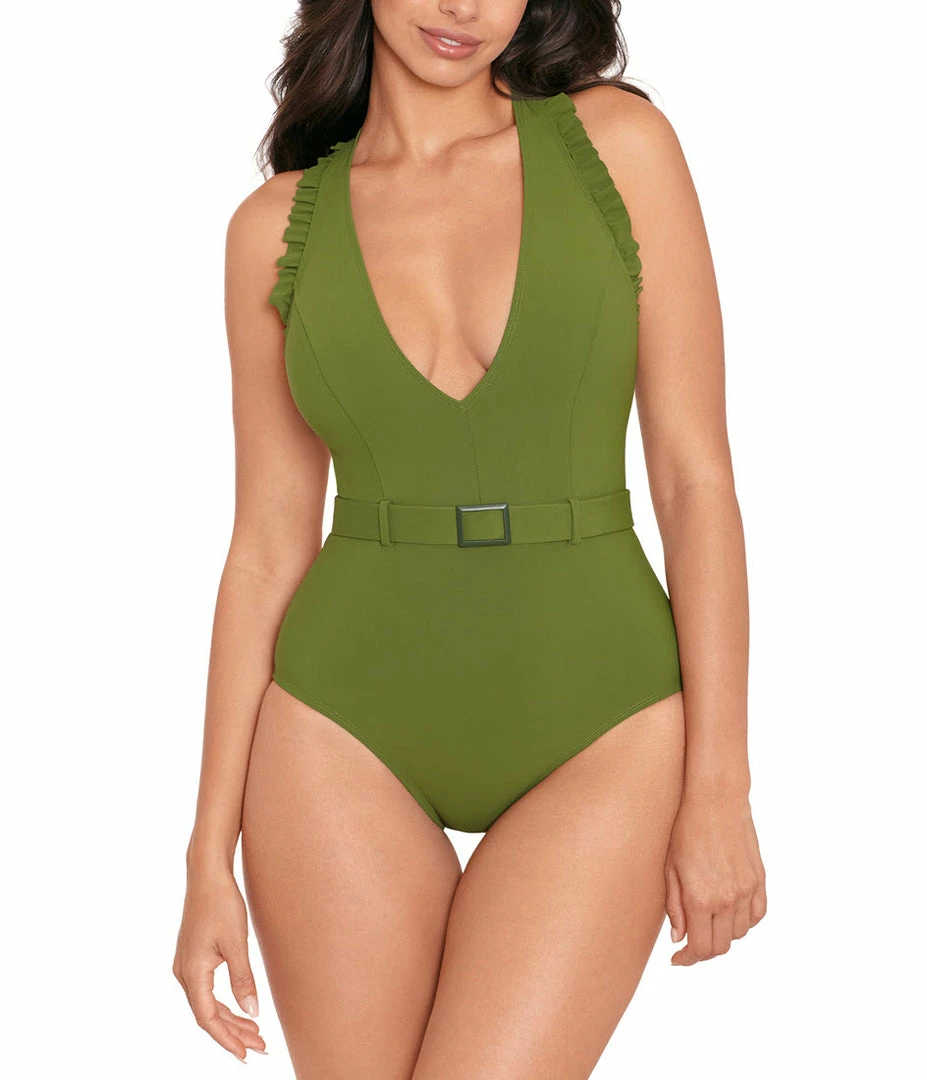 Form, function and superior flatter all meet in the Jelly Beans Cinch Swimsuit. This suit features a ruffle sleeve, belted one-piece featuring a removable soft cup and adjustable straps that lead to a low, tantalizing x-back design. Yummy tummy control offers an extra smoothing experience in this dramatically appealing suit. A basic leg cut shows off just enough skin and keeps you oh-so-comfortable from sunup to sundown.