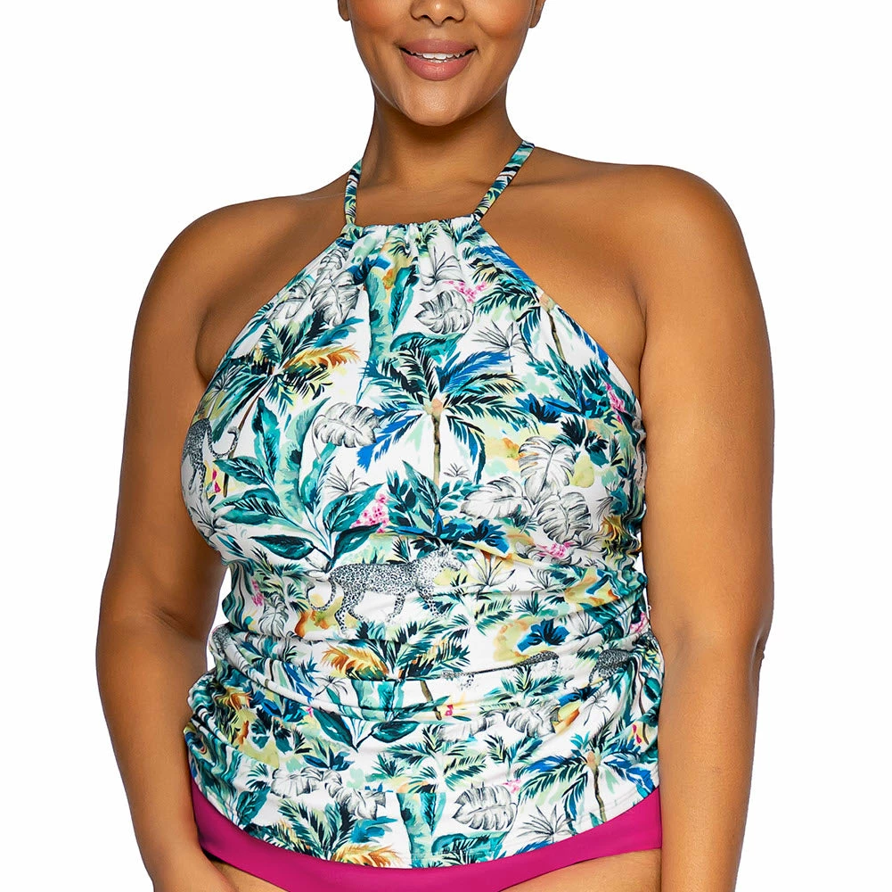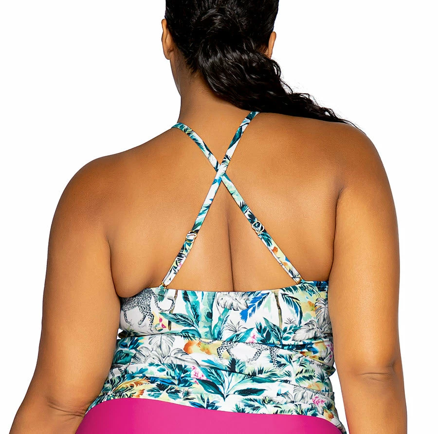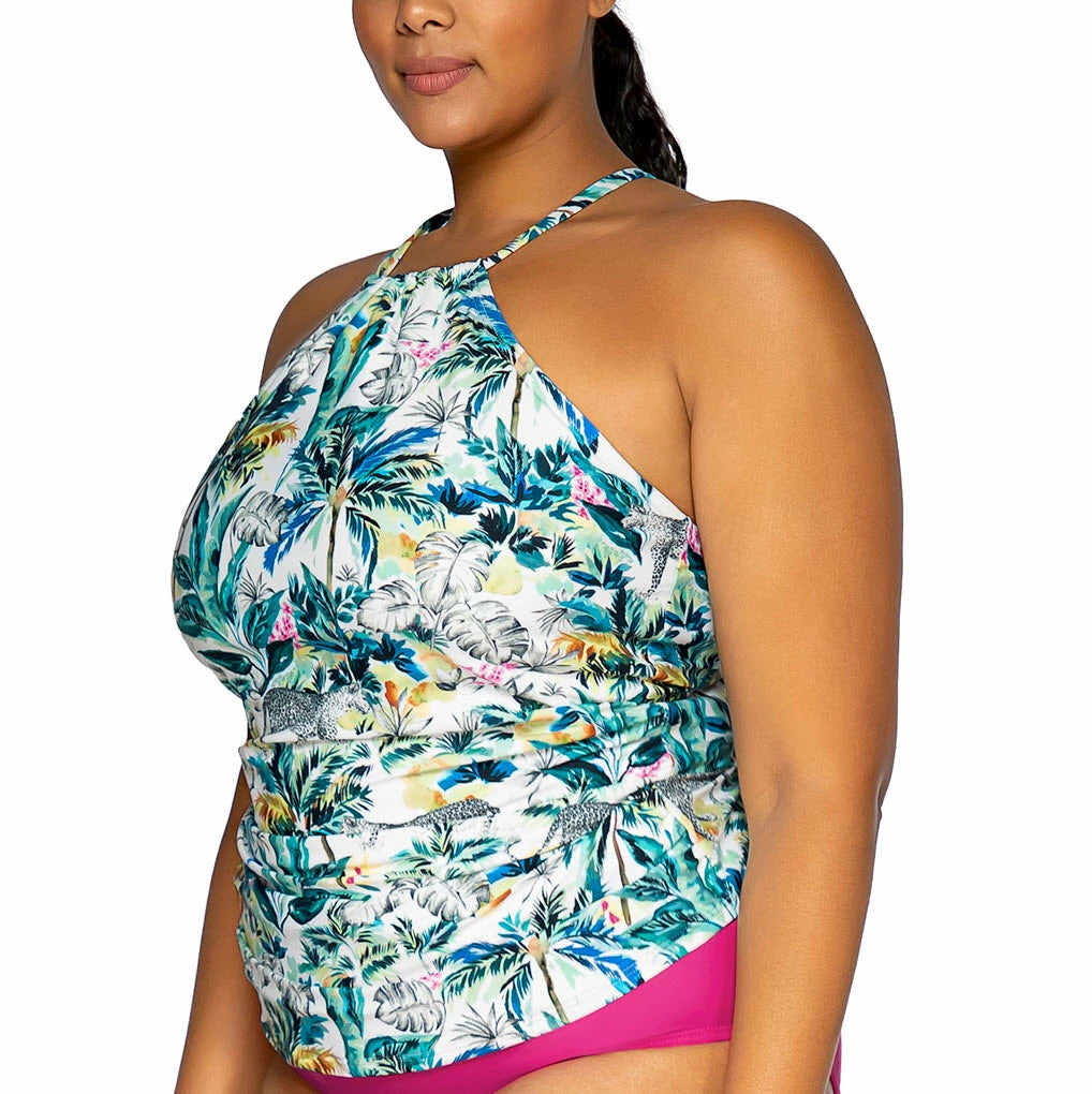 The Harlow High Neck Tankini has rouched sides and a slim fitting torso. The high neckline features adjustable feminine shirring. A cross back detail and adjustable straps make this top sporty and comfortable.