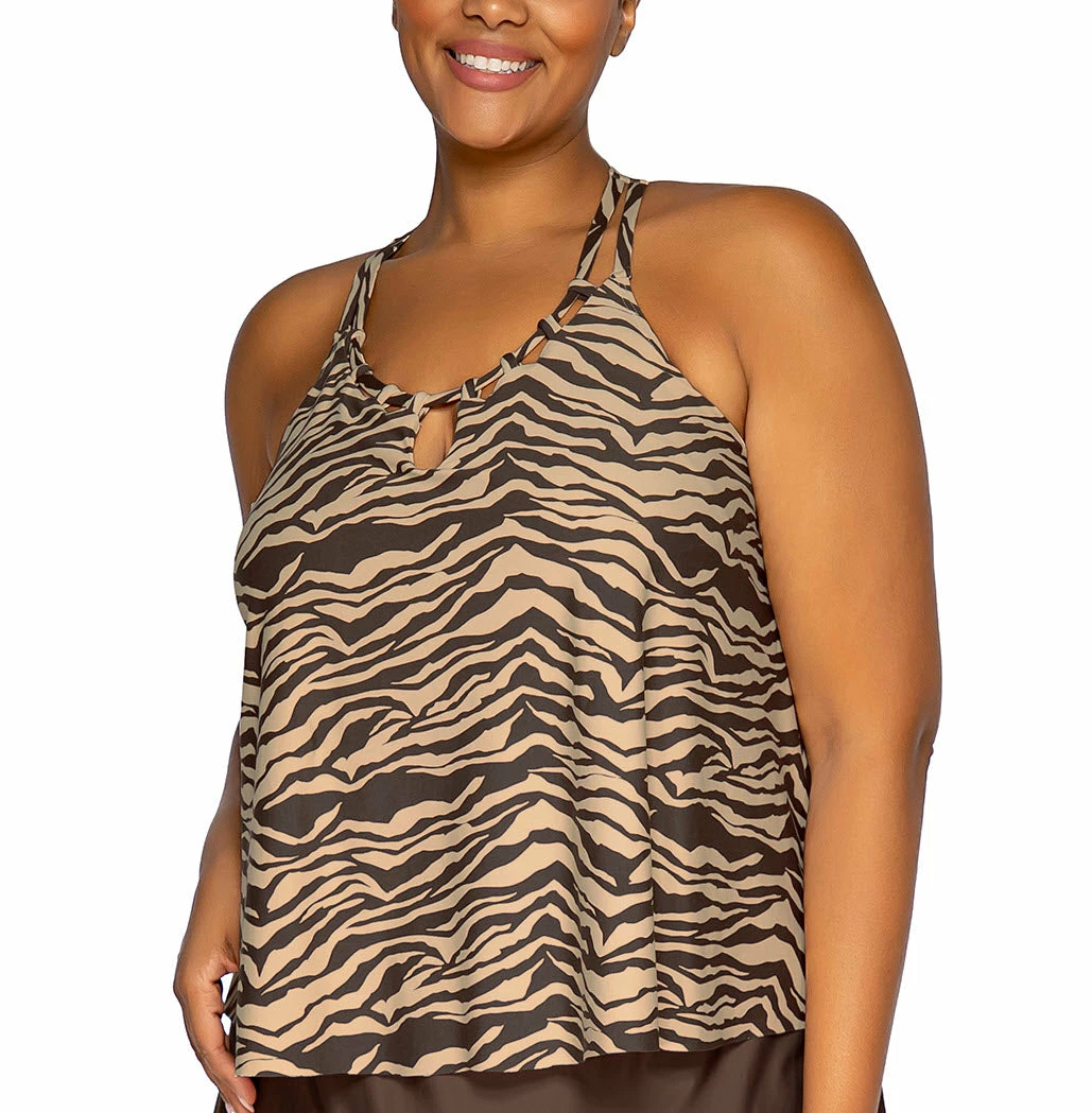 The Sadie Tankini has strapping along the high neckline with a flowy A-line silhouette. Adjustable straps and soft cups make this tankini ideal for anyone seeking comfort and style.