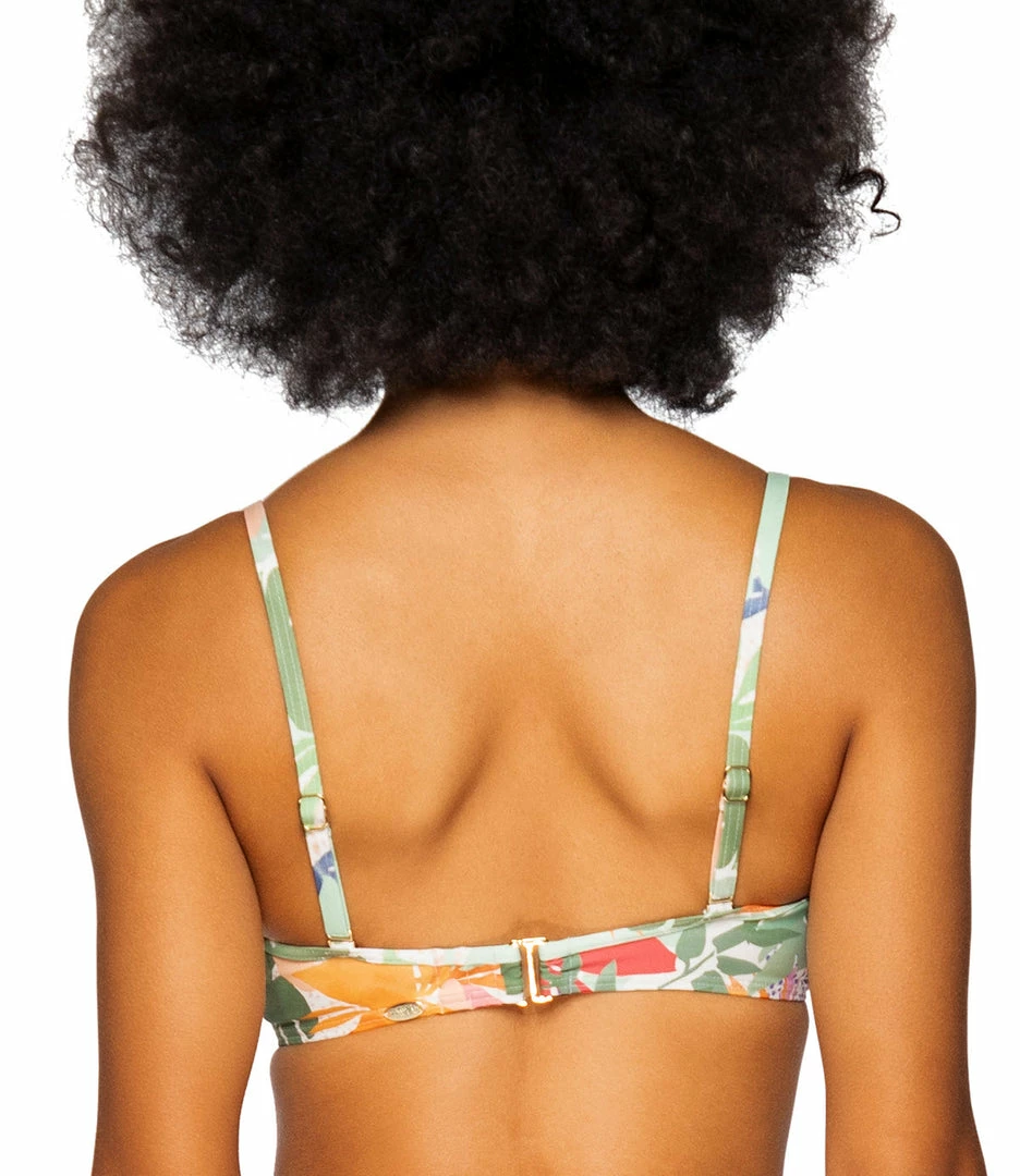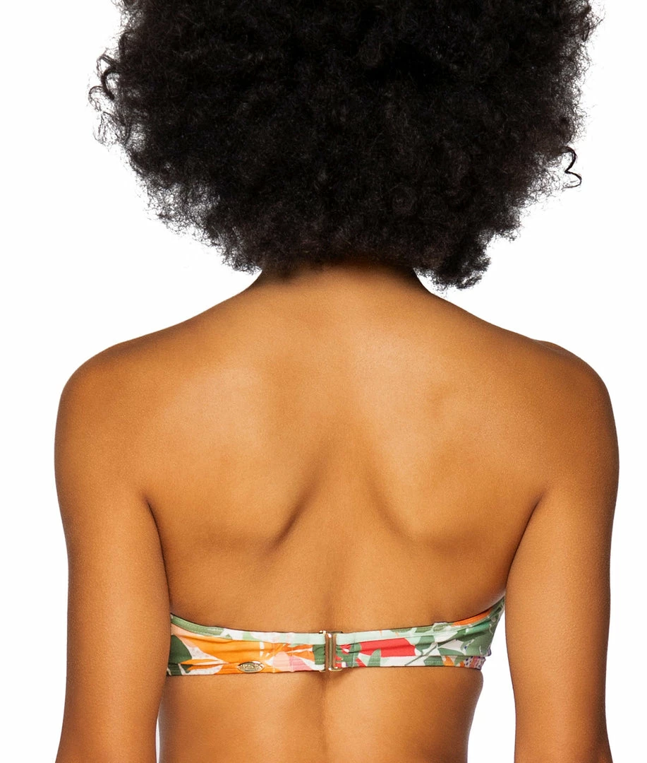Our classic Iconic Twist Bandeau top has adjustable straps that can be detached to reduce tan lines and a back hook closure with three adjustments to keep you relaxing by the pool. Features include built in foam bra for maximum support, underwire and matching colored lining. Coverage: Moderate. *Bottom sold separately. Fabric Content: 87% Recycled Nylon, 13% Spandex