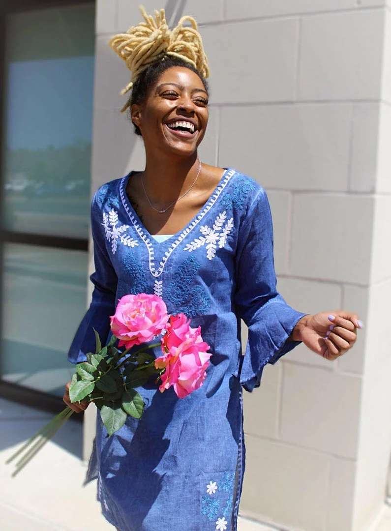 This is a hot new tunic silhouette, cut at the thigh with high side slits for those ladies who wanna get their legs out. Just like its longer sisters, the Jaira is a boho style toned-down with a simple silhouette, long flounced sleeves and beautiful embroidery.