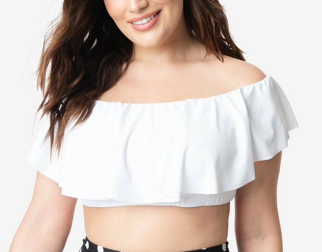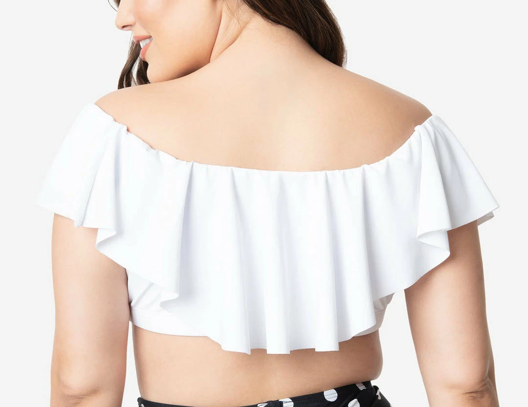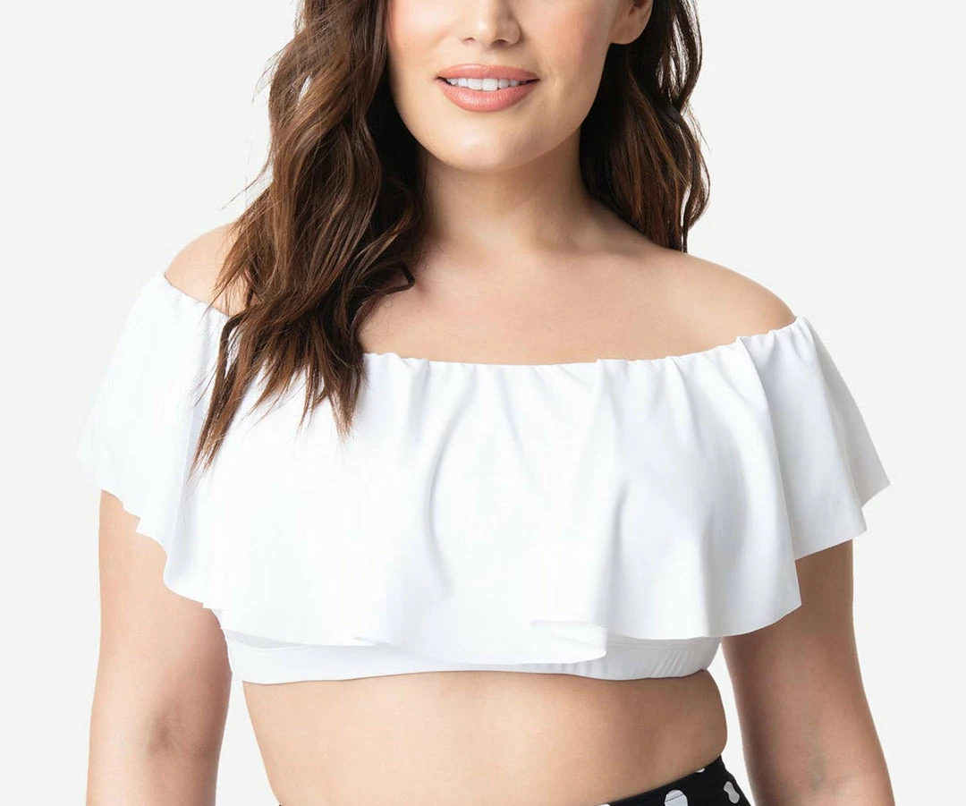 Ruffle a few hearts, darling! The playful yet sultry Plus Size Ramona Swim Top from Unique Vintage is cast in a crisp white and boasts gorgeous ruffled drapery. Lined in soft mesh, an elastic band keeps you secure while the fluttering embellishment summons grace and sophistication. Who could say no?